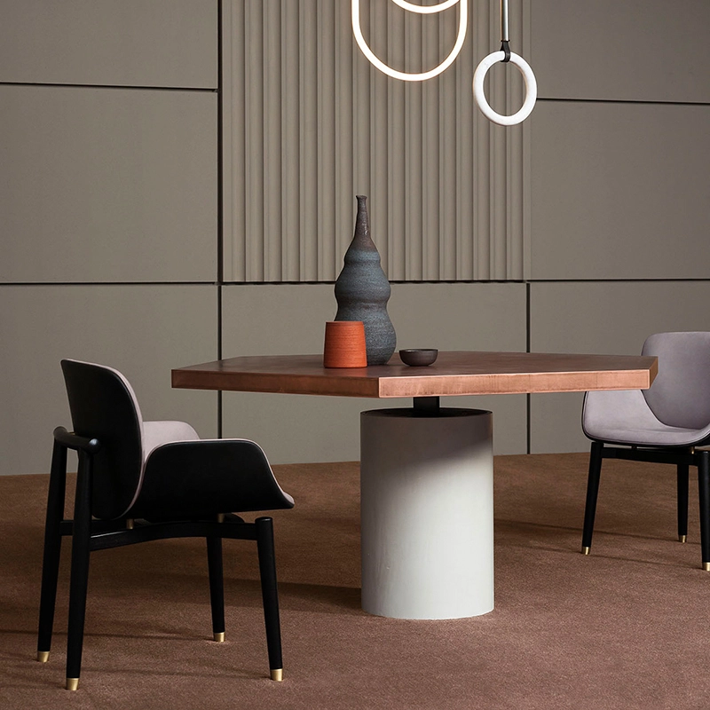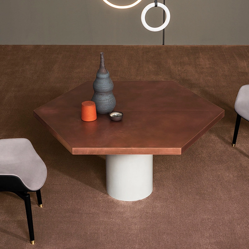 Designed by Studiopepe for Baxter Made in Italy, Jupiter is a table composed of a comparable honeycomb top covered in alpacca, antique copper or antique brass, with matt varnish. The top is fixed to a cylindrical base covered in Terra Cruda cement. The Jupiter table by Baxter Made in Italy surprises with its personality and originality and makes a statement in contemporary interiors.