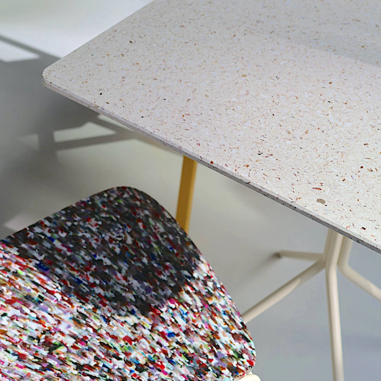 Powder-coated steel base (35% recycled), shell composite tabletop