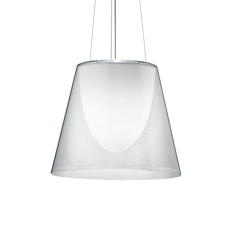 Featured in the Miss K range created by Philippe Stark for Flos, K Tribe S2 is the pendant light version. The designer plays with classic lighting forms for this pendant light which provides diffused light. It is characterised by the two diffusers that create a unique lighting effect. When switched on, light emitted by K Tribe completely reveals its internal matt white polycarbonate diffuser. The transparent external diffuser is made of PMMA. This light is suspended with the help of three stainless steel cables with a maximum length of 400cm.