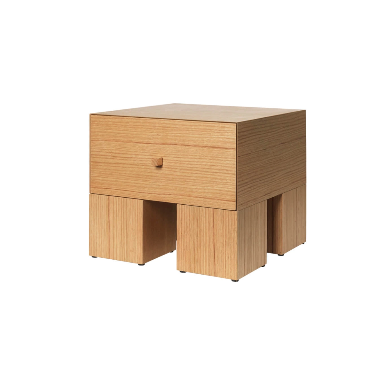 The Kuben bedside table is made of natural oak veneer certified by FSC. Its angular cubic shape and mitre joint construction create the illusion of a box with no visible joints, while the oversized cube-shaped legs add a bold character. The delicate handles add a refined touch, enhancing the playful intrigue of the design. Harmoniously combining functionality and minimalist aesthetics, it offers ample storage space and presents a modern look, perfect for any interior.