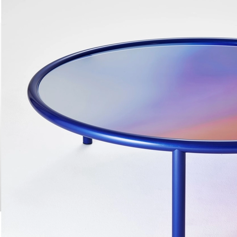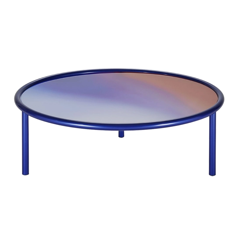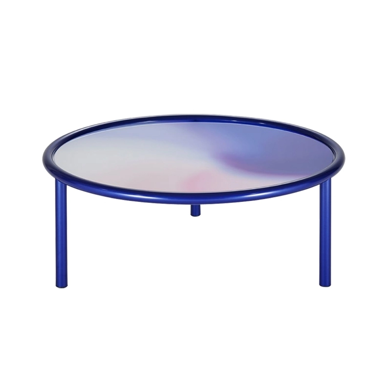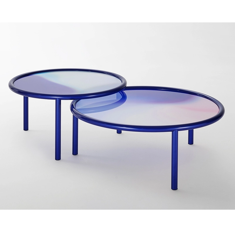 Designed by Patricia Urquiola for the Glas Italia brand, L.A. Sunset is a series of attractive and poetic coffee tables. Available in three sizes, these round coffee tables have a structure in pearl midnight blue varnished metal tubing and a top in opal laminated glass with an opaline finish. The table top is distinguished by a palette of colours that shade and blend together like gas or fluid, concealing the solid state of the material.