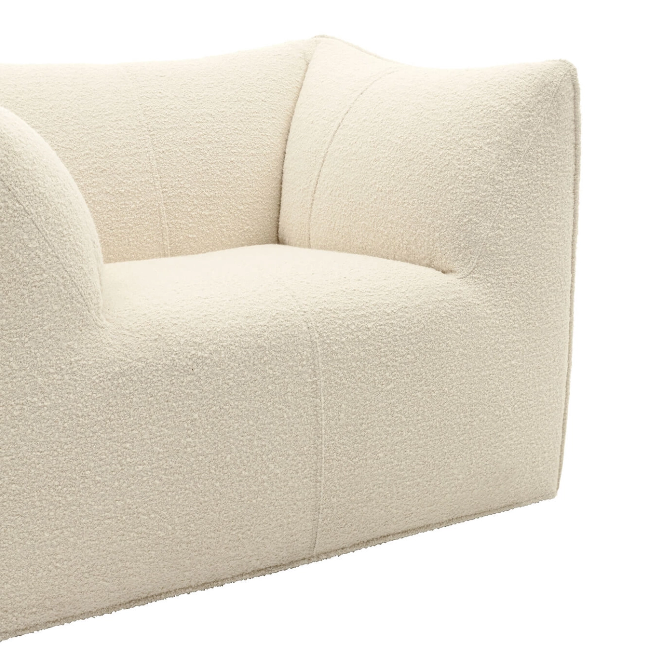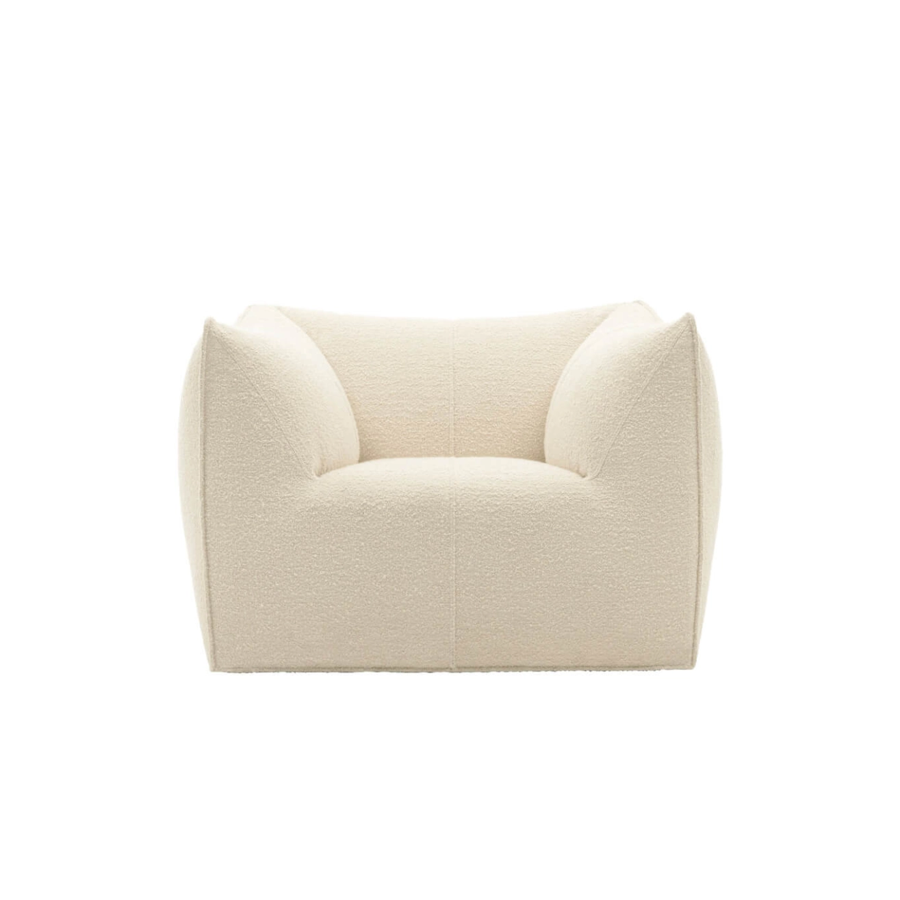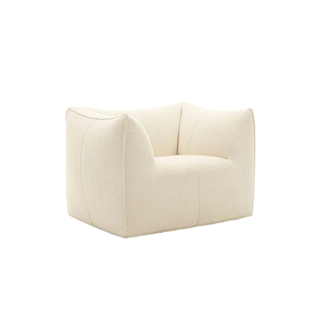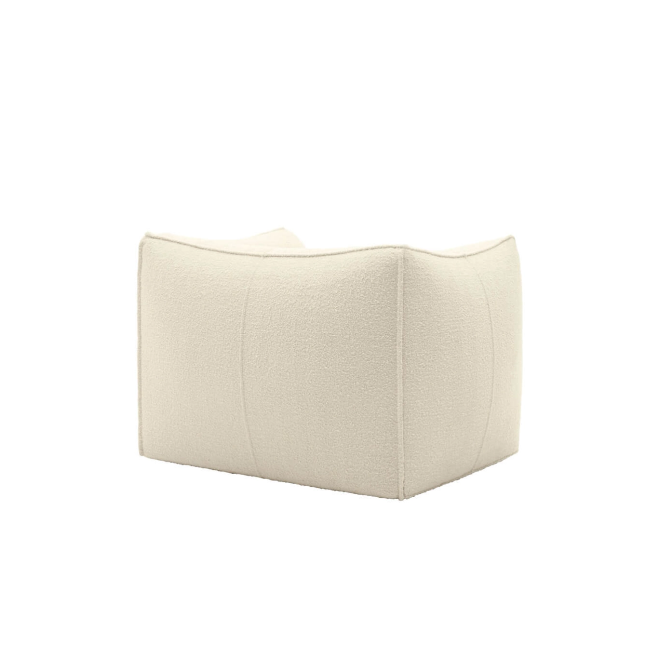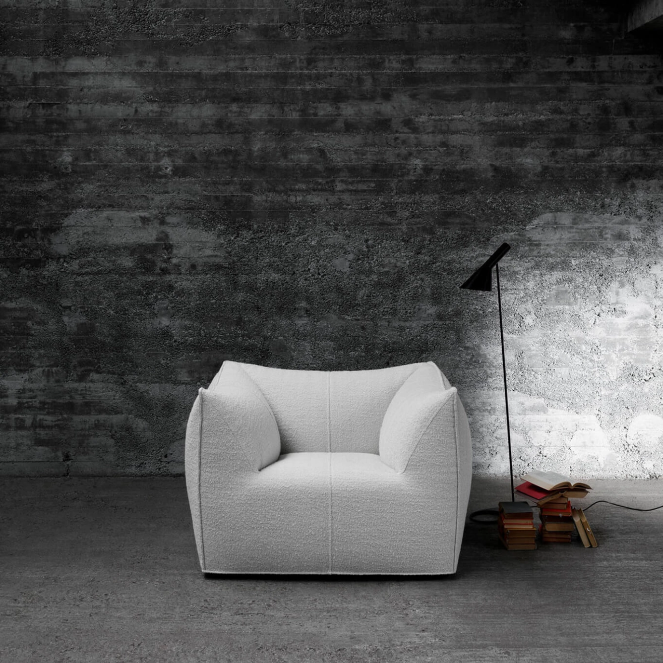 Le Bambola armchair, designed by Mario Bellini for B&B Italia, is part of the iconic Le Bambole collection originally conceived in 1972 and reimagined in 2022. A timeless symbol of contemporary Italian design, this armchair blends innovation and comfort through its unique structureless appearance and soft, organic form. Upholstered here in elegant white bouclé, it offers a perfect balance of softness, elasticity, and visual harmony. While the original model used a metal frame covered in polyurethane, today's version features next-generation materials, including recycled polyurethane for a more sustainable structure. Its eco-conscious design and modular assembly make it fully disassemblable and recyclable, reflecting a forward-thinking approach to durability and environmental responsibility.