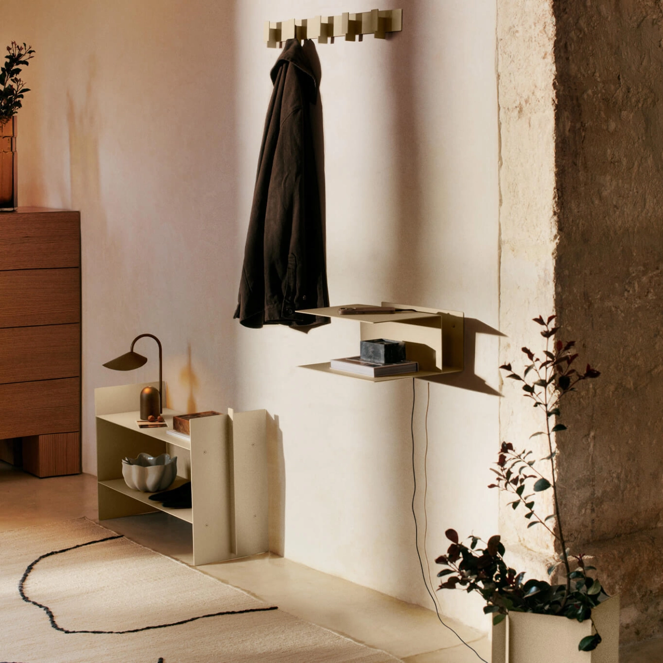 The Low Shelf Lager, which is part of the Lager family, takes its name from the Danish word meaning "warehouse" and is inspired by the industrial aesthetic of brutalism. It can be used as a shelf or as a shoe rack, making it ideal for small living spaces. Compact and functional, it optimizes storage without requiring much space. Packed flat for easy transport and simple assembly, the Low Shelf Lager offers practical storage with a clean and modern design.