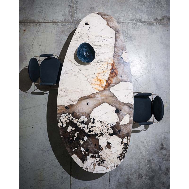 Designed in 2016, the Lagos table is part of the Baxter product range. Lagos has a majestic oval marble top resting on three cylindrical brass or iron legs of different diameters. The marble piece composing its top being unique, none of the tables is really similar to another. This Baxter table is a real centrepiece, lighting up an entire interior with its extraordinary elegance.