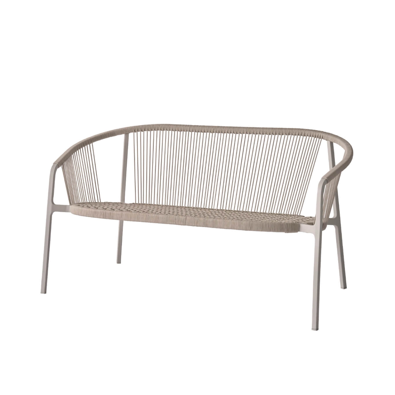 The Lagrasse two-seater by Vipp extends the same minimalist design concept found in the collection's dining chairs and lounge chairs. Perfect for relaxing or socializing in smaller outdoor spaces, this two-seater maintains the harmonious aesthetic of the series. Add cushions for a comfortable and cozy seating experience. The Lagrasse collection includes a dining chair, a lounge chair, and a two-seater, all designed with a powder-coated aluminum frame. The cushions, upholstered in Vipp's specially developed outdoor fabric, are equipped with velcro straps ensuring secure attachment to the frame for a stable and comfortable seating arrangement. A curved backrest extends to form the armrests, wrapped in woven cord to enhance the collection’s light expression. The cord offers a comfortable and supportive seat while perfectly blending style and functionality. The Lagrasse two-seater by Vipp features a stackable design for easy storage, accommodating up to four sofas. For added comfort, optional cushions in weather-resistant fabric are available.