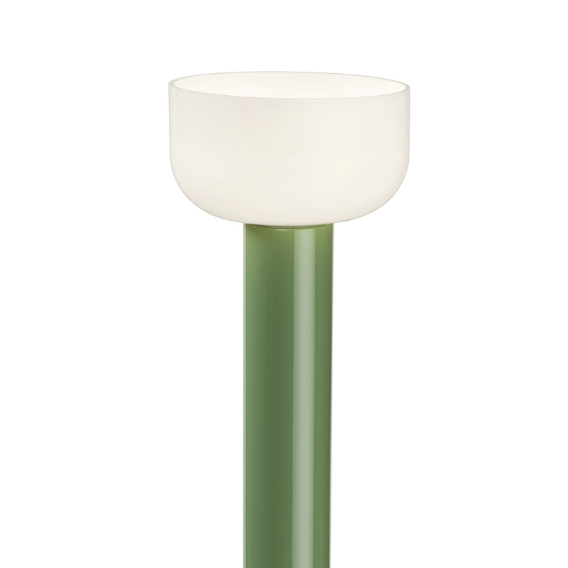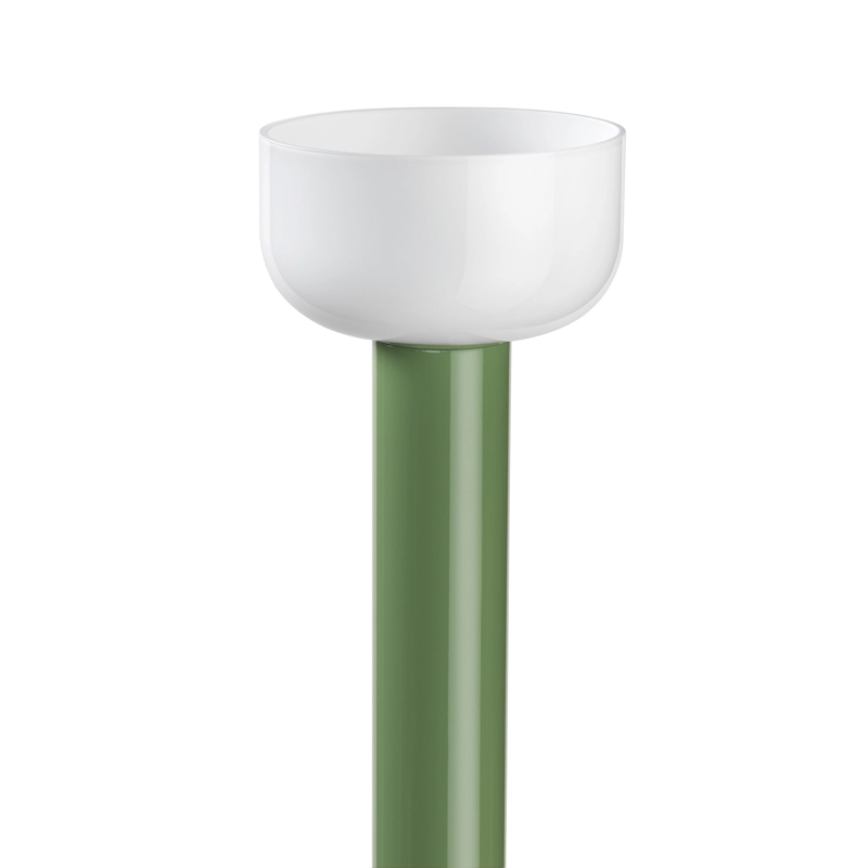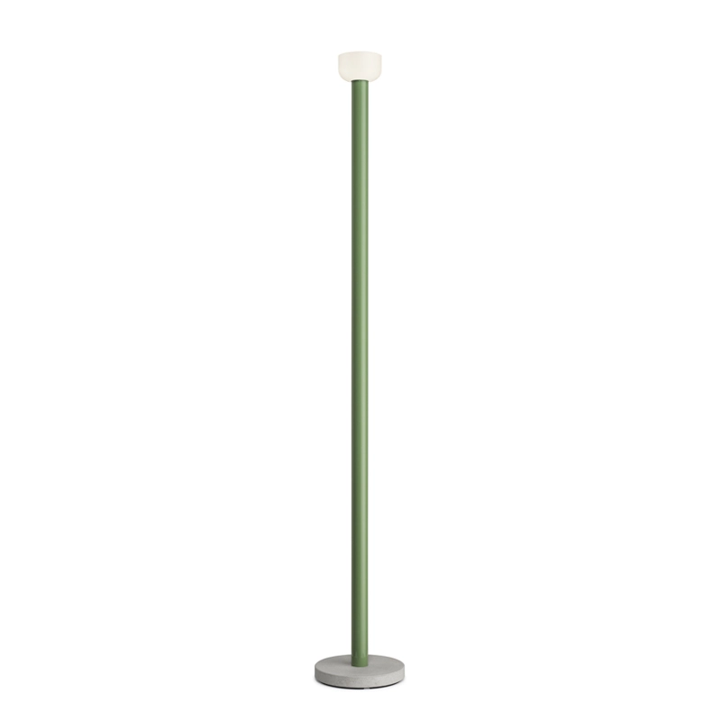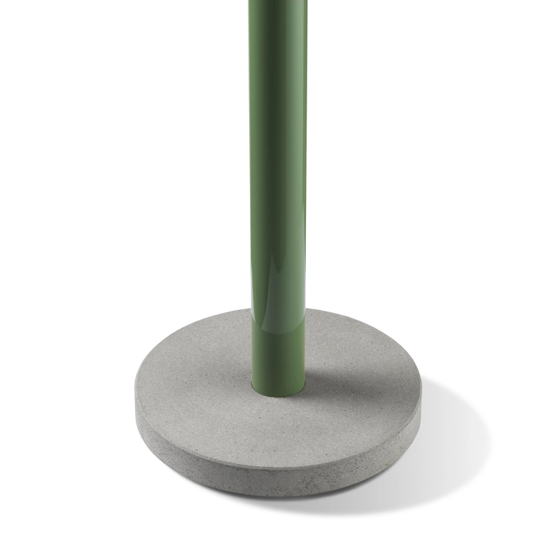The Bellhop floor lamp designed by Edward Barber & Jay Osgerby for the Flos brand, features a tubular painted aluminium stem emerging from a concrete disc-shaped base. The diffuser at the top is made of opal blown glass. Its ceiling-directed light also provides glare-free side lighting, and the intensity of the light can be adjusted using a foot-operated dimmer on the cord. The simple, compact design of Bellhop makes it a discreet, elegant floor lamp. It will fit in perfectly in places like the living room or communal areas.