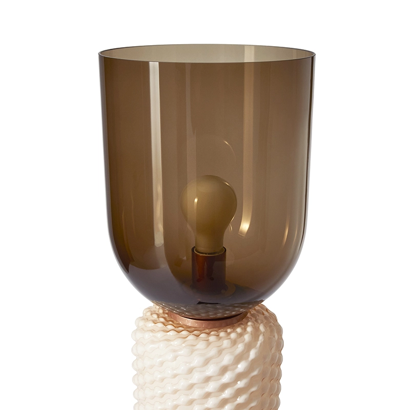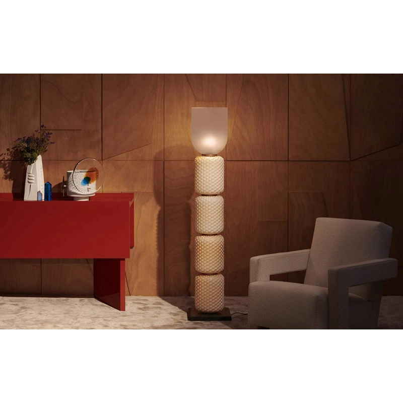 The Ficupala floor lamp edited by Cassina stands out for its eclectic style that combines postmodernist and art deco elements, recalling the organic forms of plants. The Ficupala lighting collection consists of a table lamp, a floor lamp and a suspension lamp. The lampstand and Ficupala table lamp feature a precious marble base, and a blown glass diffuser and body available in a range of colours. The Ficupala floor lamp by Cassina features a light pink structure and its blown glass diffuser comes in light pink or taupe. The modernity of collection Ficupala is characterised by a finely worked and textured surface, offering a refined aesthetic thanks to the use of noble materials. Each luminaire features meticulously crafted details, highlighting the quality of the finishes and adding a touch of elegance to any space.
