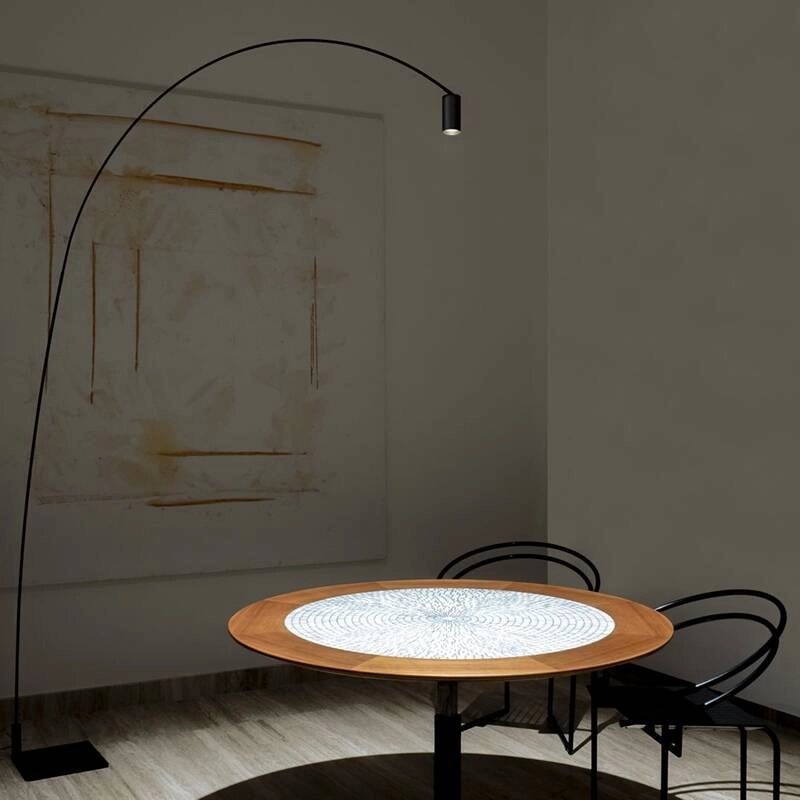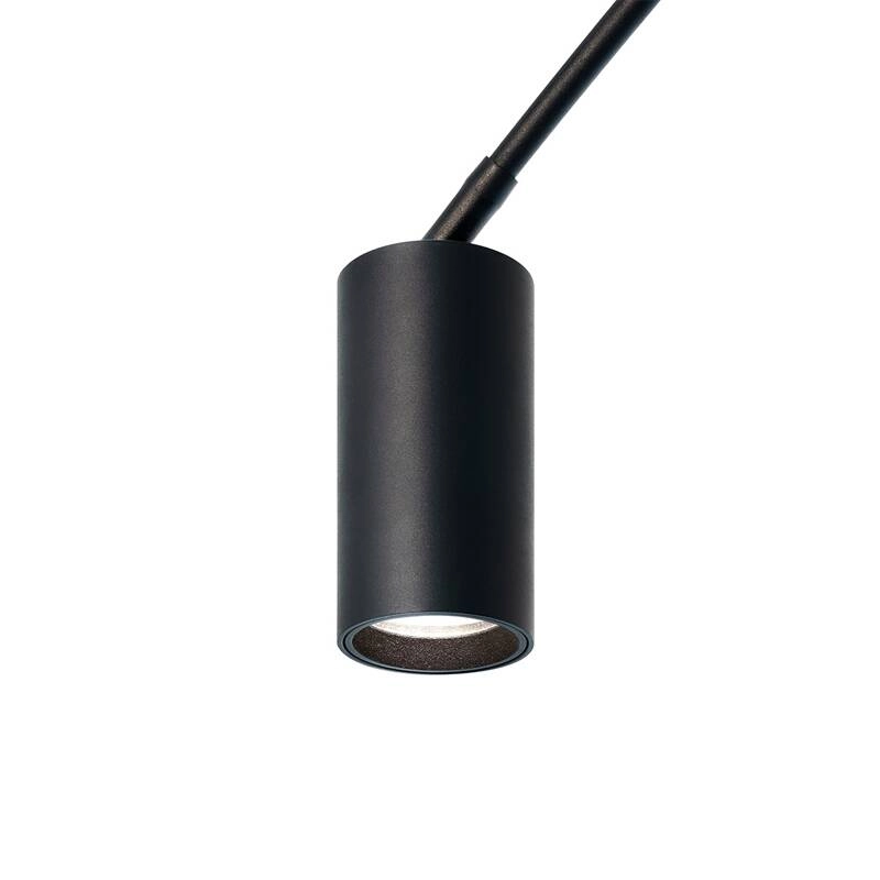 This black aluminium luminaire features a pivoting arc and a cylindrical head that can be adjusted to direct the light beam precisely and evenly. The lighting heat of Fox is adjustable by a dimmer on cable.