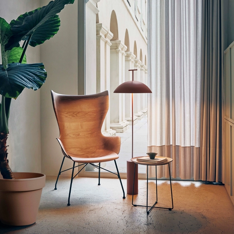 The Geen-A floor lamp, designed by Ferruccio Laviani for the famous brand Kartell is composed of a straight cylindrical base and a stem supporting a dome-shaped diffuser. The Geen-A floor lamp also features a dimmer switch designed to provide optimum lighting for reading.  The GEEN-A floor lamp by Kartell is available in three colours: black, white and brick red. This luminaire with its simple, round and balanced geometric shapes will bring you great comfort for your evening reading.