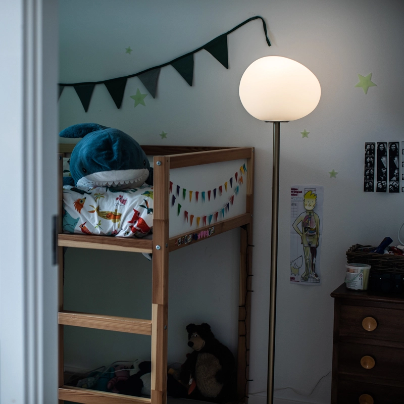 Gregg floor lamp, available in two sizes, provides glare-free lighting in the living room or bedroom.