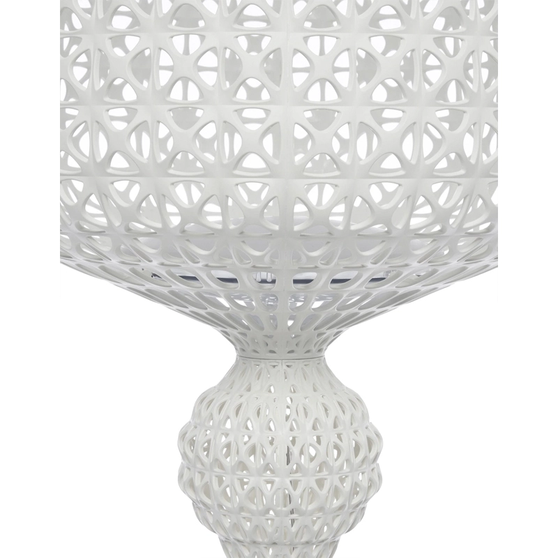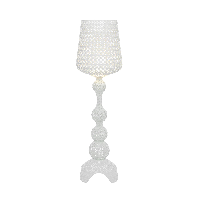 Kabuki is a floor lamp designed by designer Ferruccio Lavani for brand Kartell.  Elegant and sophisticated, the Kabuki lamp is dressed in lace from head to foot. The Kabuki lamp surprises and stands out with its neo-baroque lines and openwork surface. Its characteristics play with the transparency of light to create superb shadow projections. The Kabuki Lamp is a light, delicate design encapsulated in meticulous, handcrafted crochet work. Kabuki introduces us to plastic in a completely new and innovative way. The Lamp Kabuki comes in a range of transparent or opaque finishes and colours: green, crystal or light blue.