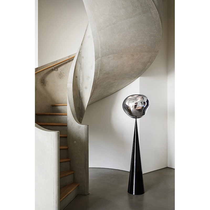 The Melt Cone Fat floor lamp, designed by Tom Dixon, evokes an artistic fusion of melting glass and galactic landscapes. Learn more