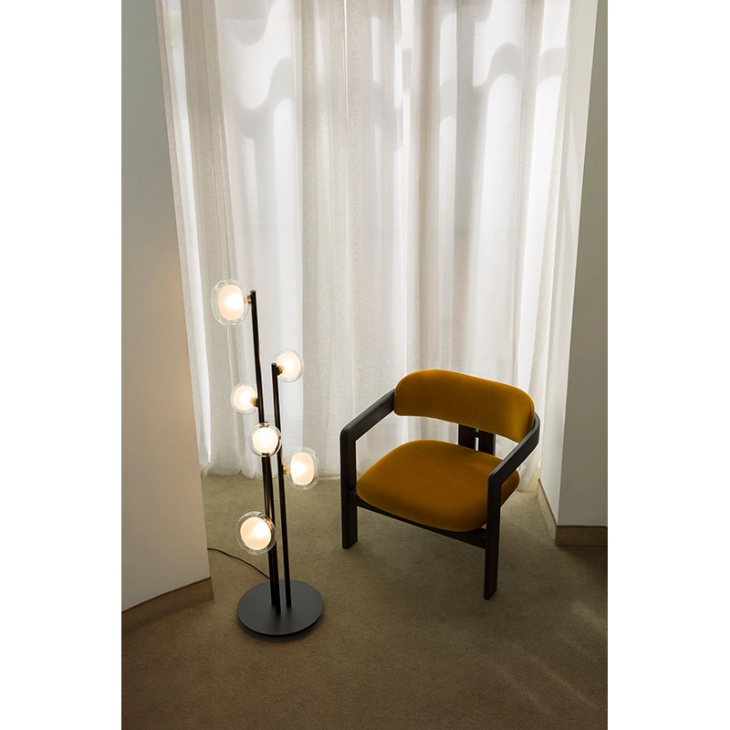 Drawing inspiration from 50s lighting design, the luminaires in the Nabila collection from Tooy embody elegance and sophistication, bringing a touch of refinement to any space. The Nabila 552.66 floor lamp features double-walled borosilicate glass light globes and an epoxy powder-coated metal frame, embellished with brushed brass or black chrome details. Combining luxury with sobriety, the Nabila 552.66 floor lamp embodies true elegance in a single element. With Nabila, Tooy offers a wide range of lighting fixtures from sumptuous chandeliers available in different sizes to smaller versions designed for bedside tables, lampadaries and wall sconces.
