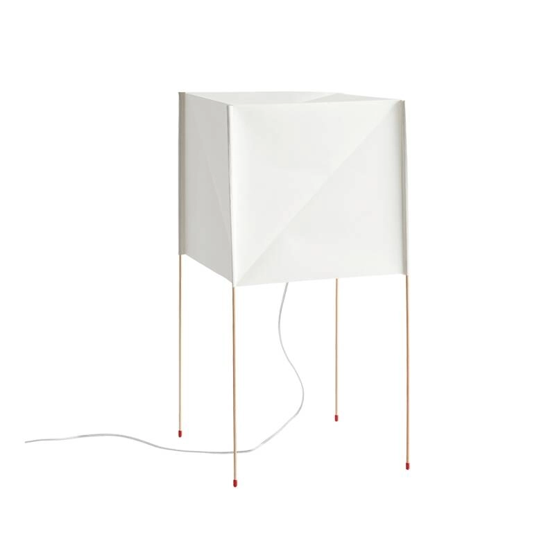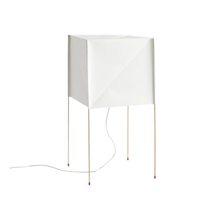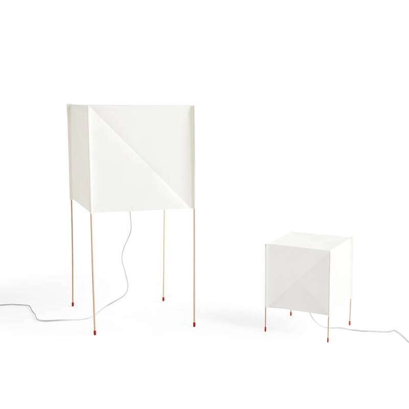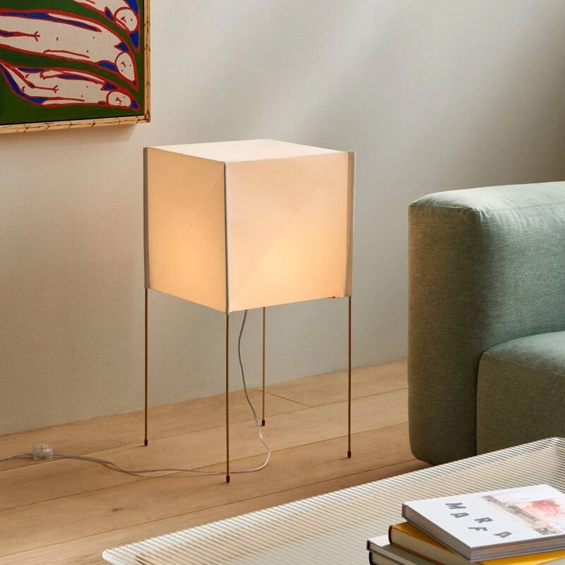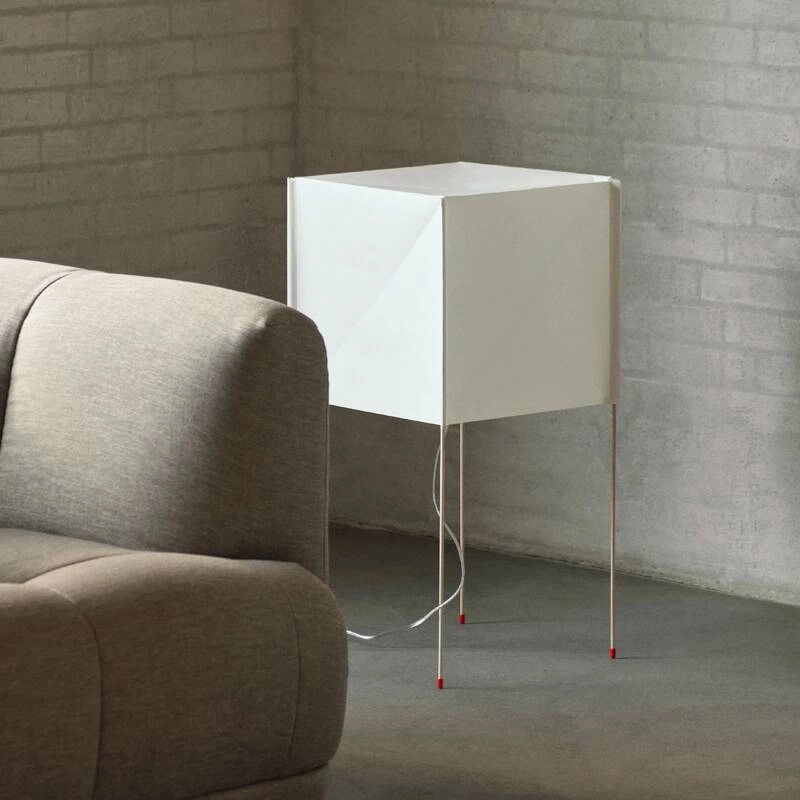 Designed by Bertjan Pot for Hay, Paper Cube is an elegant and functional lamp. Inspired by the construction mechanics of folded paper decorations, Paper Cube comes flat-packed and easy to assemble. It is made from sturdy Japanese paper made from recycled plastic bottles, with slender legs in FSC-certified beech. The translucent diffuser is a closed volume that creates a soft, atmospheric glow. Suitable for any room in the house, Paper Cube is available as a table lamp or floor lamp.