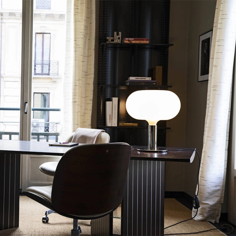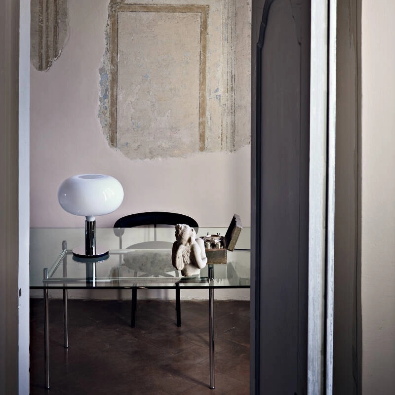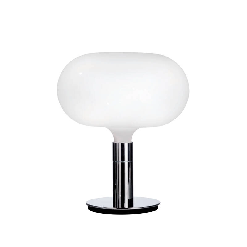 Albini AM1N is a table lamp with a chromed metal structure. Its onion-shaped diffuser is made from white opal glass. The light emission of the Albini AM1N lamp is particularly diffused, ideal for illuminating interiors with elegance.