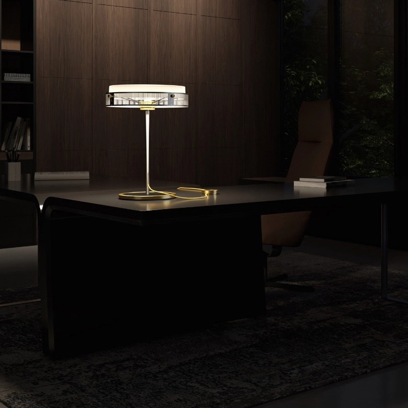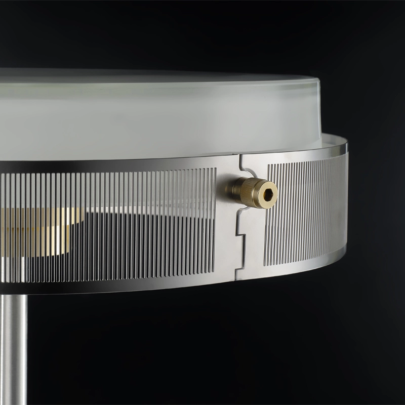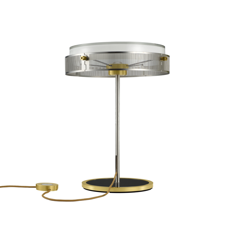 The Anima table lamp created by Jean-Michel Wilmotte is the fruit of the first collaboration between the famous architect and the Lumina brand, and is presented as a true reinterpretation of the lamp with shade.  Anima consists of a classic aluminium lamp body, a light source masked by an opal glass diffuser that emits a soft, pleasant light, and an external structure made up of 4 pieces of photo-cut steel.  This assembly is held together by a brushed stainless steel rod that houses and reveals the fabric power cable, the colour of which matches the metallic finish of the lamp.  The Anima lamp rests on a transparent glass base defined by an anodised ring, and fitted with a dimmer. The Anima luminaire promises to be a particularly contemporary take on the lamp with shade, without excluding its functionality. Anima lends itself to the decoration of classic and modern interiors, with strong atmospheres, but also to small spaces such as offices, where the lamp reinforces the character.