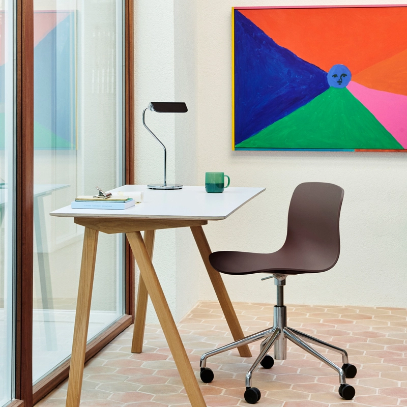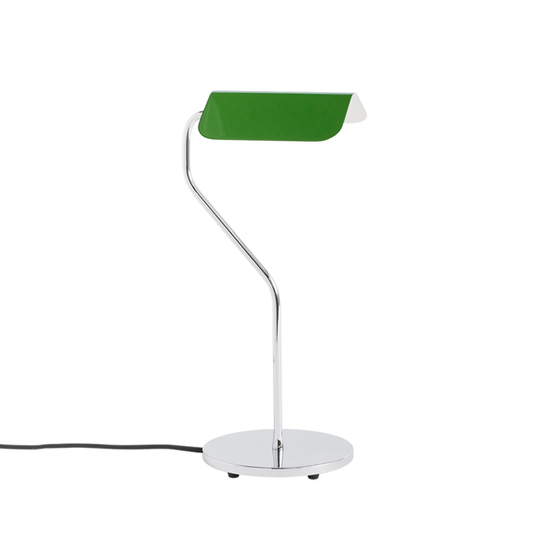 Taking inspiration from the classic banker's lamp, designer John Tree fuses archetypal references with his contemporary sensibilities to create the Apex Lamp. The folded steel shade creates a pointed roof silhouette, providing a graphic contrast with the chrome base. The shade can rotate 360°, allowing the user to direct the light as they wish. Edited by Hay, Apex is a functional lamp, perfect for a multitude of spaces and uses.