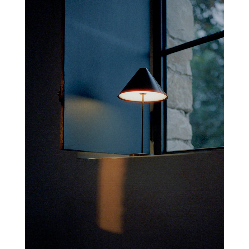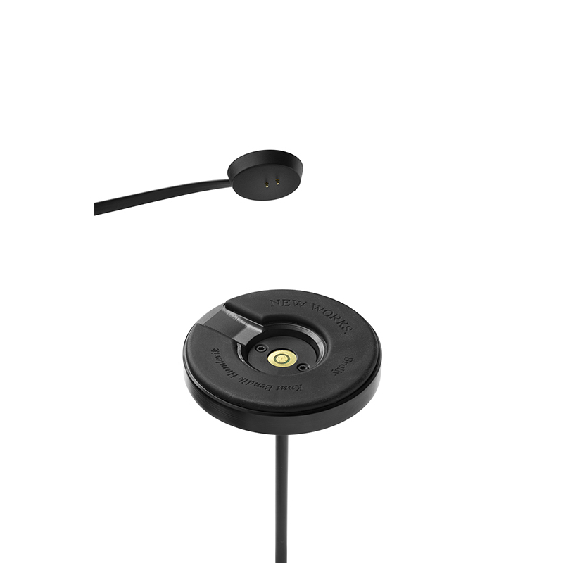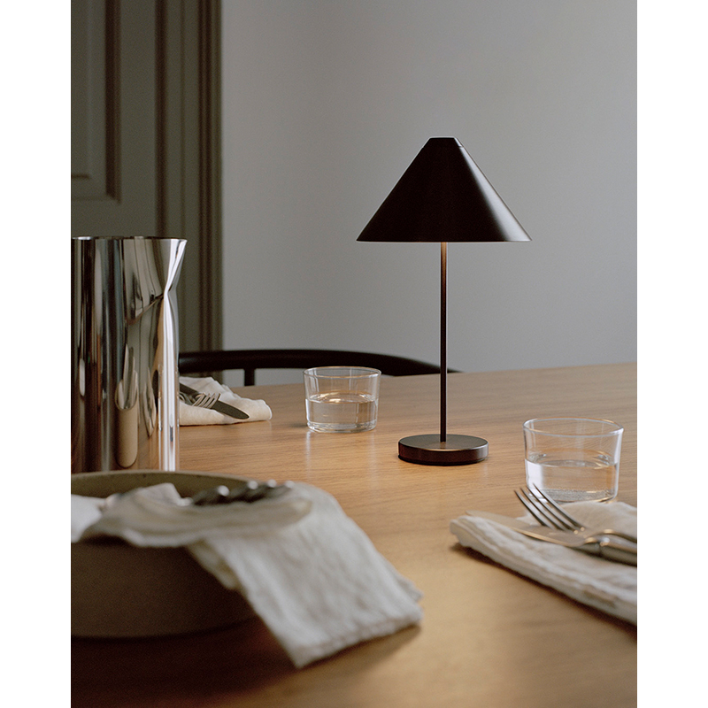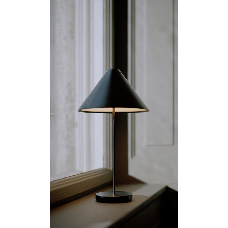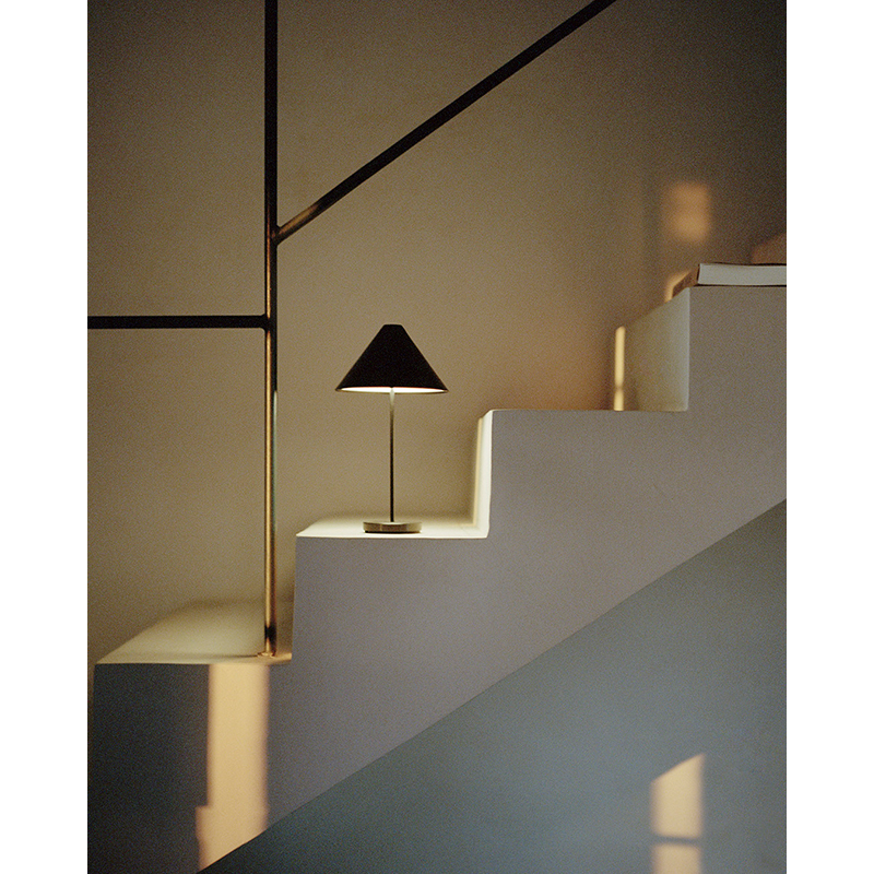 Designed by Knut Bendik Humlevik for New Works, Brolly Portable is a cordless table lamp in brushed steel with a simple, streamlined silhouette. Elegant and timeless, this little lamp will suit any interior style. Brolly goes wherever light is needed. This portable lamp features a strict geometric design and a delicate stem supporting the conical shade. The Brolly portable light recharges using a magnetic charger that attaches to its base. A three-level dimmer lets you adjust the brightness to suit your needs.