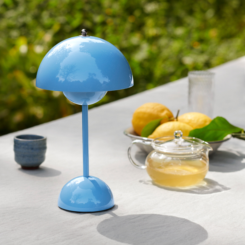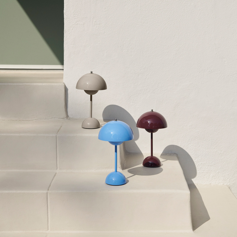 In 1968, the student riots in Paris, Rome and the United States overthrew the old, overly severe values and brought in the "Flower-Power" generation of peace, love and harmony. In the same year, Stanley Kubrick imagined the future, the year 2001, featuring in his film the Panton chair that had become a design classic and man was about to set foot on the moon. In the world of design, a colourful and fun pendant lamp was blooming in restaurants and exhibitions and was soon seen in homes, too. The FlowerPot lamp, with its two half spheres facing each other, features a timeless, high-quality design, edited by & Tradition. With a wide choice of colours, the FlowerPot VP9 table lamp is very practical thanks to its battery operation. With the cable removed, it can easily be moved around, finding the perfect spot in both homes and communal spaces.