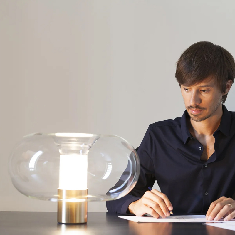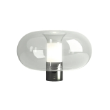 With Fontanella, Fontana Arte offers an elegant lamp that highlights two historic materials in the brand's tradition: metal and glass. The metal forms the base and contains the light source, while the glass, the real protagonist of the project, is skilfully worked by skilled craftsmen in a fusion process between a transparent glass section and a satin-finish section from which the light is diffused. The Fontanella lamp is distinguished by the union of two glasses: a sandblasted inner tube, connected to a bubble-shaped piece of blown glass. What makes the process particularly refined is the manual assembly of these two pieces, which requires the technique of a craftsman. For example, Fontanella is a soft, sculptural diffused light lamp that will fit in with any style of interior.