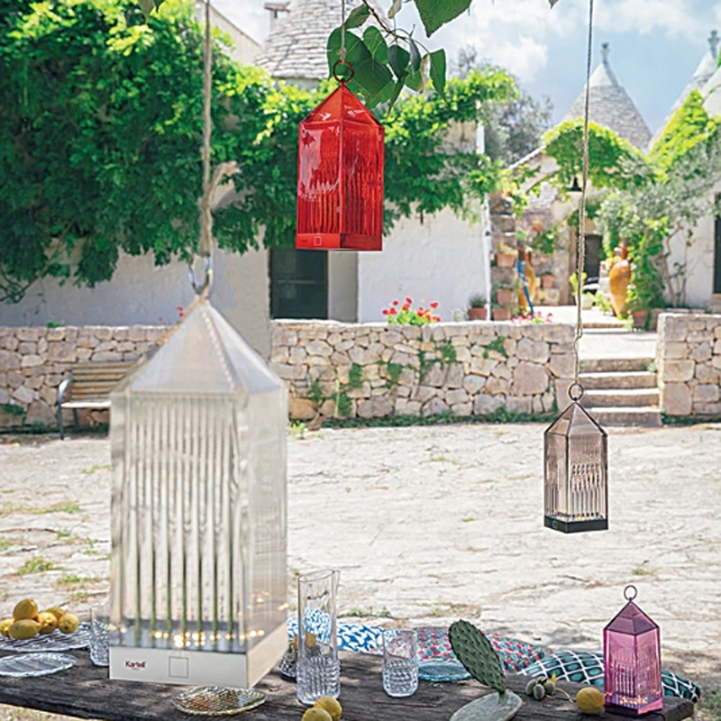 The Lantern table lamp was designed by Fabio Novembre for the Kartell brand. Lantern is a portable, lightweight, functional and original LED lamp. This handy little lamp is easy to recharge on its conductive base. Transparent and injection-moulded, Lantern diffuses a soft, graphic light, thanks to its fluted surface.