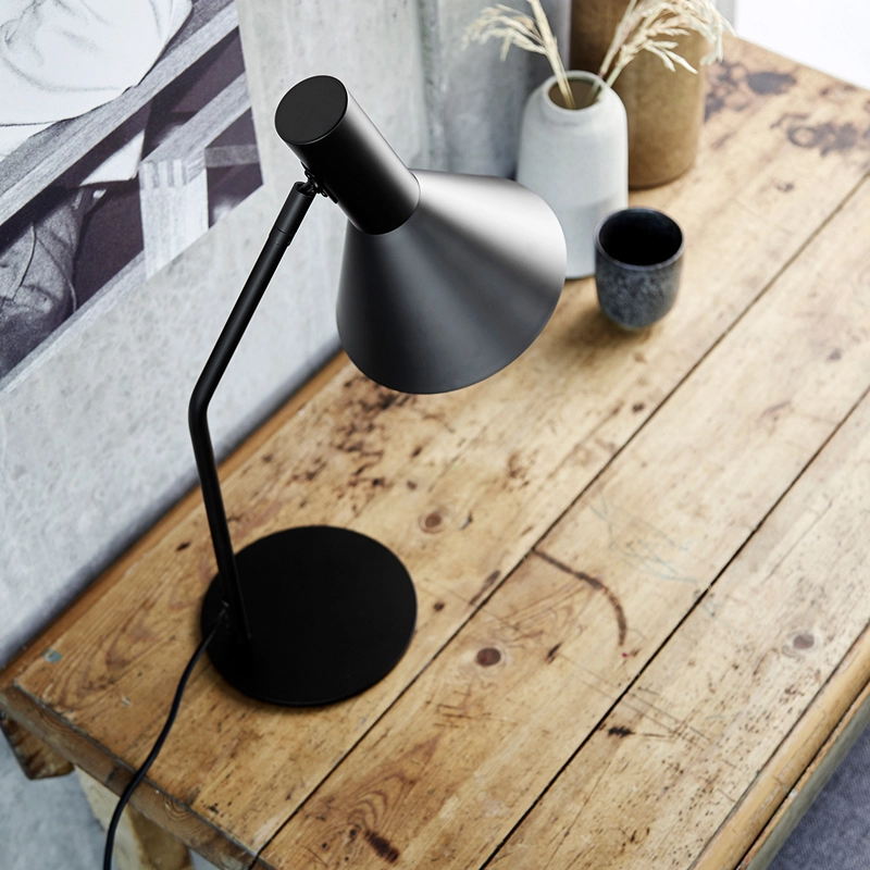 With its clean, minimalist lines and emphasis on functionality, Toni Rie's Lyss lamp series for Frandsen draws on the best traditions and qualities of Danish design. The conical lampshade, with its reflective white interior, directs the light exactly where you need it. A tilting joint is located between the lampshade and the arm. The lamp is equipped with a matching switch and fabric cord that complement the simple, monochrome look. In matt light grey and matt black, Lyss complements most interiors, while the almond version is an elegant match for the warm glow of teak, smoked oak and rosewood – the characteristic woods of the golden age of Danish design. Lyss is available as a table lamp, floor lamp and wall lamp.