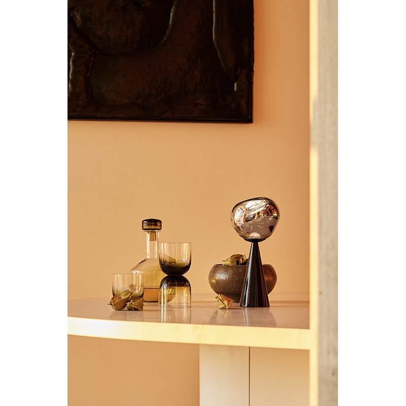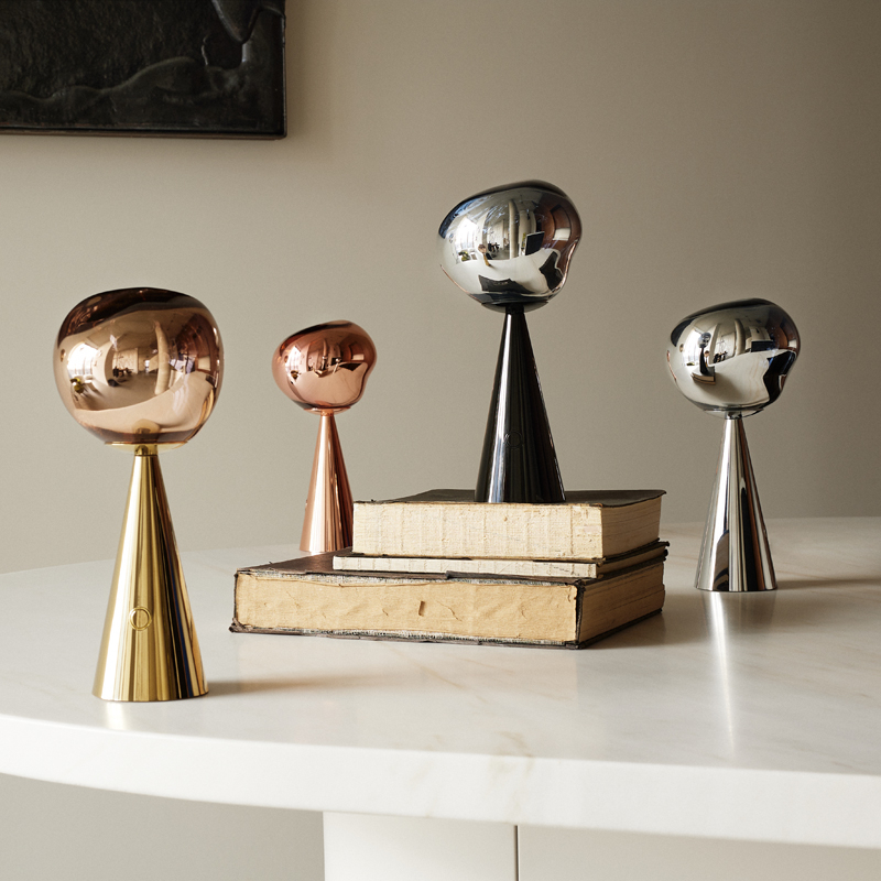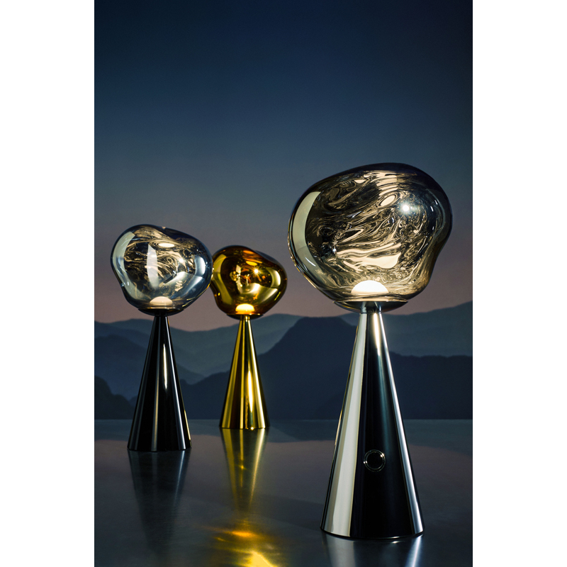 TheMelt Portable LED table lamp, designed by Tom Dixon, evokes an artistic fusion of melting glass and galactic landscapes. Melt Portable LED diffuses an organic, natural light, reminiscent of hot-blown glass, thanks to a blow moulding and vacuum metallization process. This mountable lamp rests on a cone-shaped base, creating a striking silhouette. Melt Portable LED embodies modern, artistic aesthetics while combining elaborate engineering. Once lit, it casts a captivating light, adding a touch of magic to any space. Melt Portable by Tom Dixon represents a captivating piece of lighting that blends nature and technological creativity for a fascinating visual experience. Thiscordless table lamp features an LED lighting system and offers over 10 hours of autonomy.