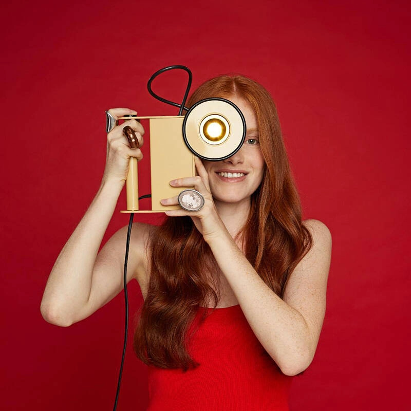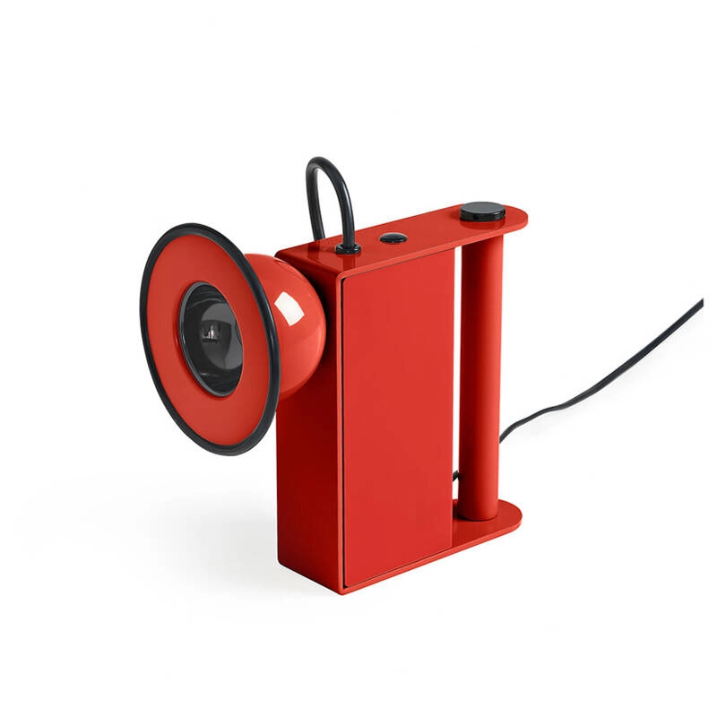 Designed by Gae Aulenti and Piero Castiglioni in 1981 for Stilnovo, the Minibox table lamp features a metal body, a comfortable handle and an irreverent luminous eye, reminiscent of the aesthetics of miners' lamps. The Minibox head's magnetic coupling lets you direct the light, making it suitable for any space, even the most unexpected.