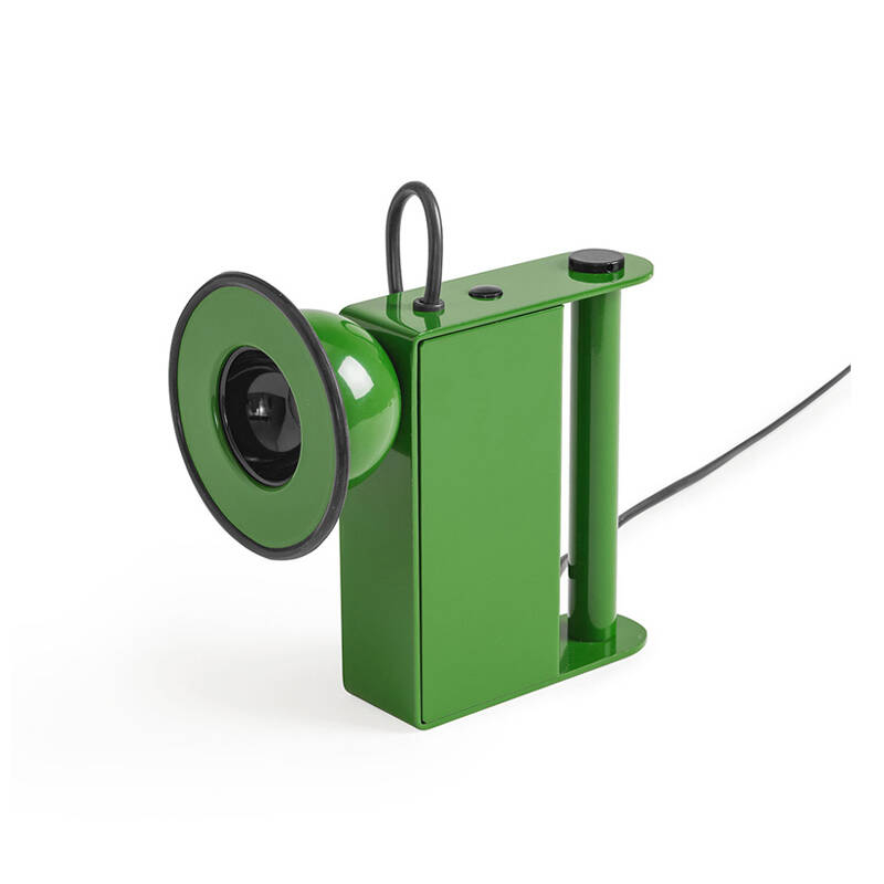 Designed by Gae Aulenti and Piero Castiglioni in 1981 for Stilnovo, the Minibox table lamp features a metal body, a comfortable handle and an irreverent luminous eye, reminiscent of the aesthetics of miners' lamps. The Minibox head's magnetic coupling lets you direct the light, making it suitable for any space, even the most unexpected.