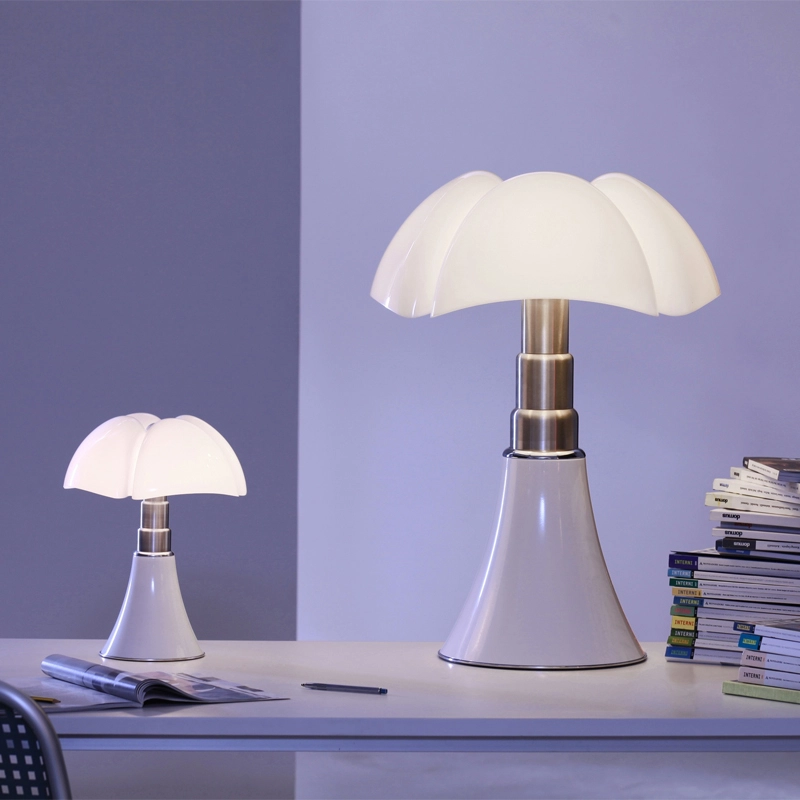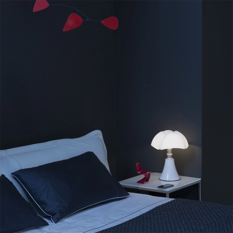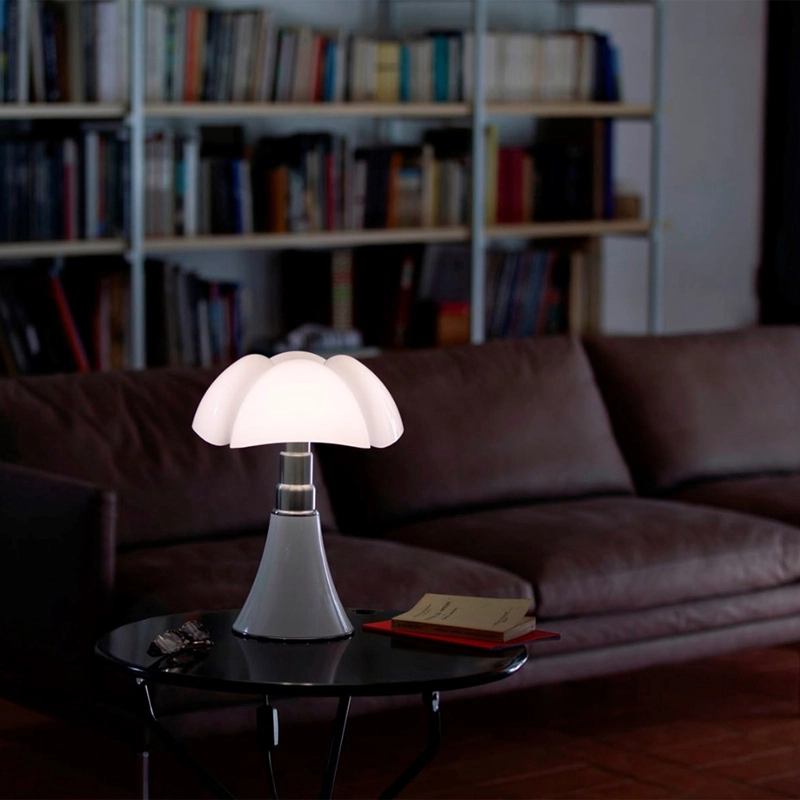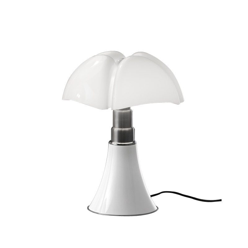 Minipistrello is a mini version of the famous Pipistrello, a design classic designed in 1966 by Gae Aulenti. The queen of Italian design for over 50 years, the Pipistrello Martinelli Luce lamp features a metal tulip base, telescopic brushed stainless steel arm and opaline white methacrylate diffuser. The Minipipistrello Martinelli Luce is a table lamp with diffused light. It has an integrated LED source and a dimmer switch. The design of the diffuser is inspired by the wings of the pipistrello, the European bat from which it takes its name. The shape of the flared base expands in height, widening at the ribs of the diffuser like the wings of a bat. The diffused light that the Minipistrello Martinelli Luce reflects and the ingenuity of its telescopic arm have helped build the success it enjoys today.