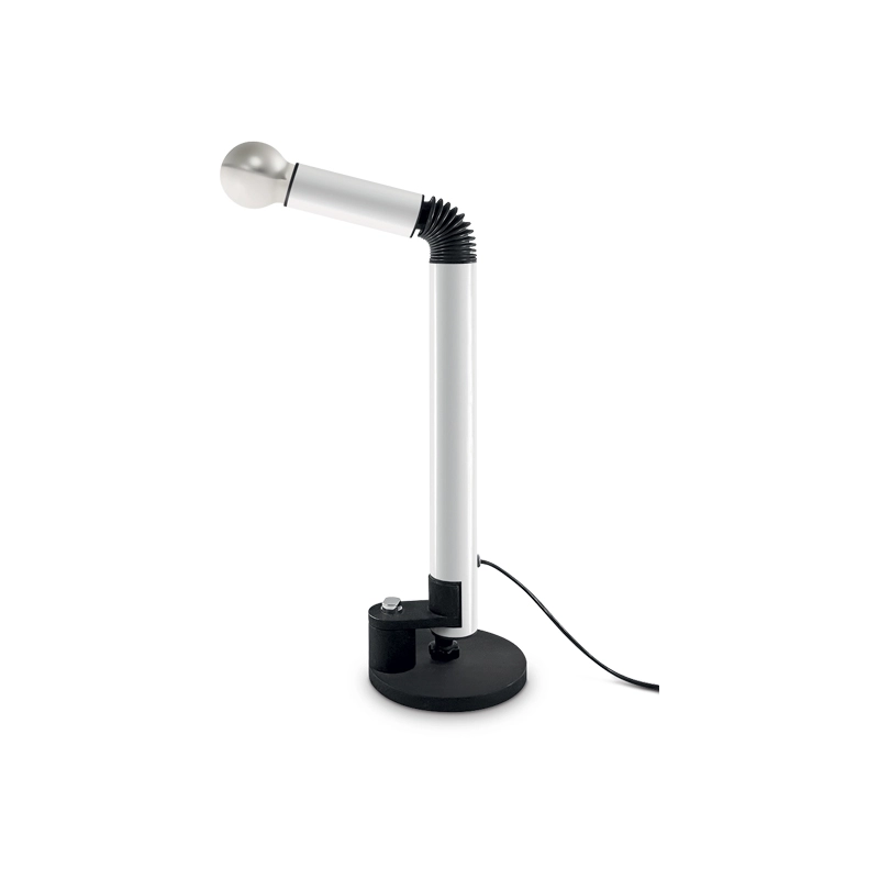 The Periscopio collection of luminaires edited by Stilnovo was designed in the midst of the "space age". The soft rubber covering the joint is reminiscent of the joints in astronauts' suits. The arm articulation and rotation system allows Periscopio to be adjusted to virtually any position. The special LED source, half of which is covered with a silver surface, prevents glare. The Periscopio luminaires are available as table lamps and in two floor lamp sizes.