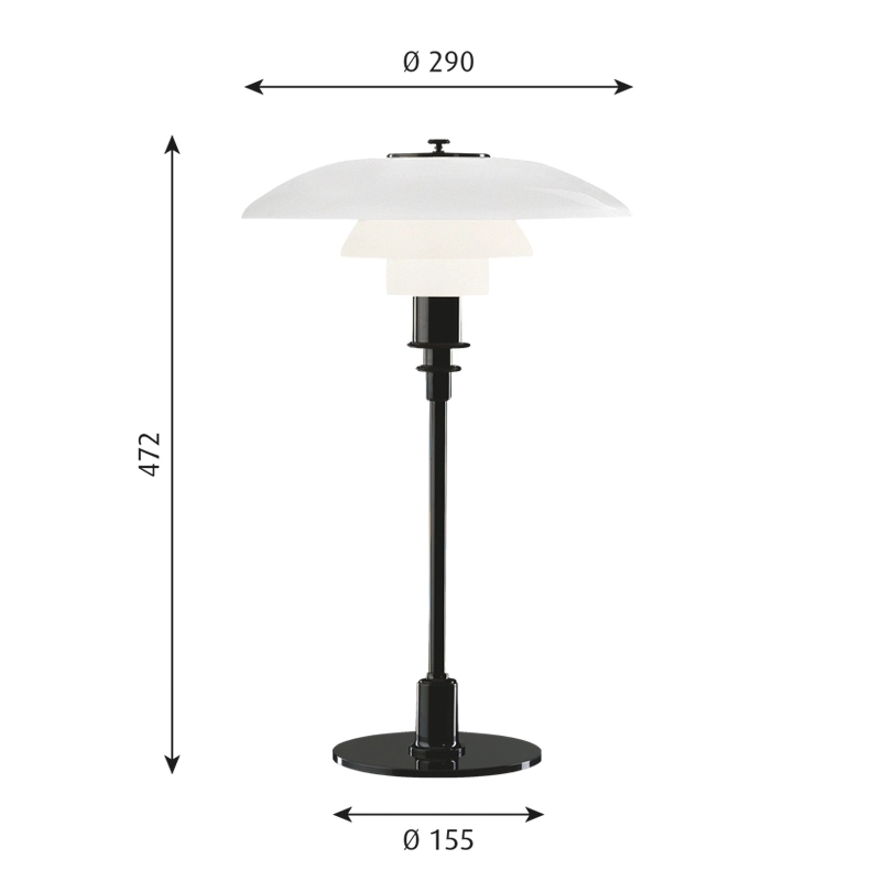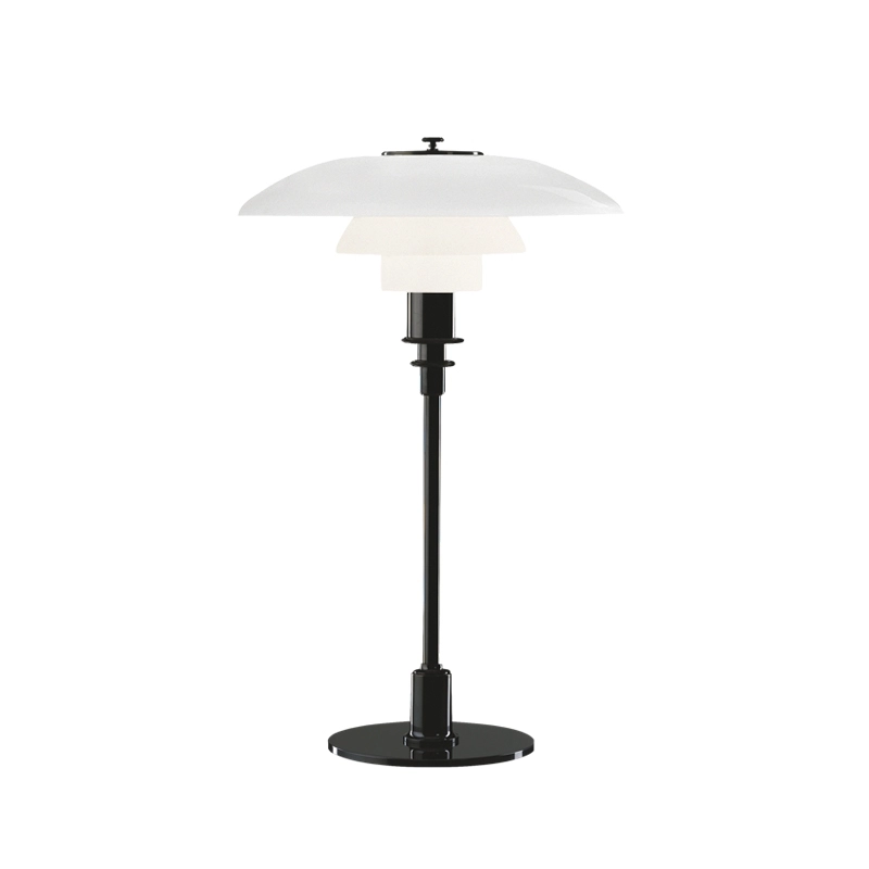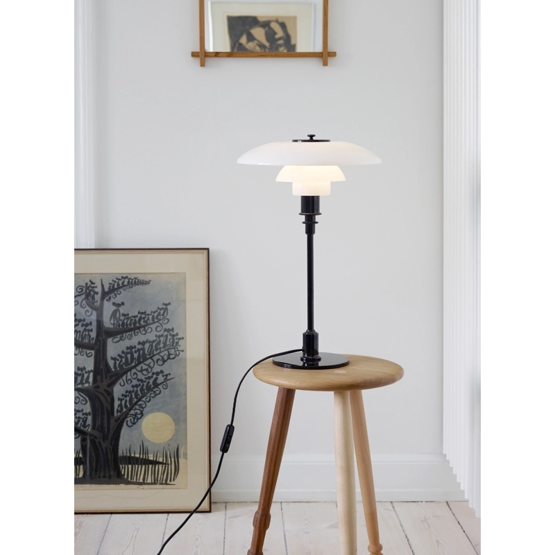 The PH 3/2 Table luminaire designed by Poul Henningsen for Louis Poulsen is based on the principle of a set of reflective shades, which directs most of the light downwards. The shades are made from three layers of blown opal glass, polished on the outside and sandblasted on the inside, giving off a soft, diffused light. Timeless, the PH 3/2 Louis Poulsen lamp fits in with any interior style.