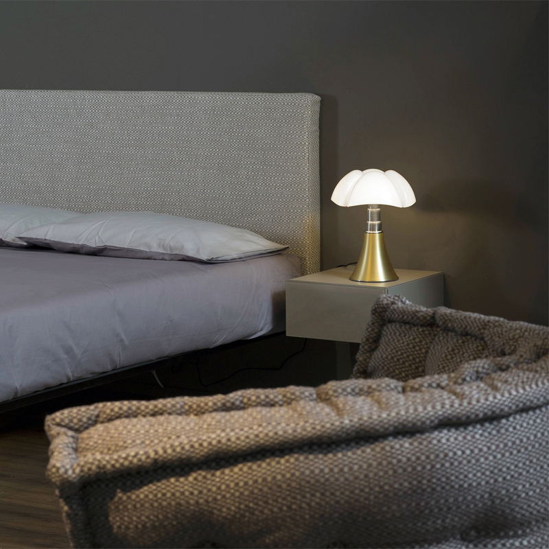 table lamp with diffused light. Smaller than the classic version, its height can be adjusted between 50 and 62 cm, thanks to a telescopic system. This version is fitted with an integrated LED source and a dimmer. The design of the diffuser is inspired by the wings of the pipistrello, the European bat from which it takes its name. The shape of the flared base expands in height, widening at the ribs of the diffuser like the wings of a bat. The diffused light that the