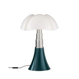 table lamp with diffused light. Smaller than the classic version, its height can be adjusted between 50 and 62 cm, thanks to a telescopic system. This version is fitted with an integrated LED source and a dimmer. The design of the diffuser is inspired by the wings of the pipistrello, the European bat from which it takes its name. The shape of the flared base expands in height, widening at the ribs of the diffuser like the wings of a bat. The diffused light that the