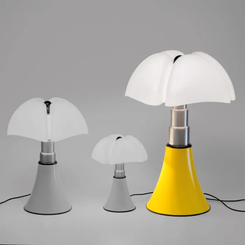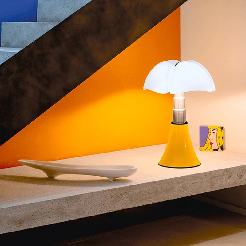 An inimitable lamp with a strong character, Pipistrello designed by Gae Aulenti in 1965 for the Olivetti showroom in Paris, is currently published by the Martinelli Luce lighting house.  Pipistrello Pop features the same variations as the original lamp: large, medium and mini, with the latter version also available cordless. Now available in a new yellow colour, signed and numbered. The new yellow colour of Pipistrello Pop evokes light, optimism and energy. According to Emiliana Martinelli, "Colour is one of the hallmarks of Pop art, whose protagonist is the everyday object that becomes art, and the iconic Pipistrello is tinted a bright, full, graphic yellow that recalls this artistic movement". The cone of Pipistrello Pop is highlighted by a central ring, the base and the diffuser attachment knob, painted gloss black to give the luminaire its graphic appearance. The dimmable LED light source is integrated and the electronic ballast is plug-in. The original Pipistrello Pop became iconic for its ability to combine originality and innovation. The choice of a bright yellow perpetuates this spirit by going beyond aesthetics to become a symbol of vitality, energy and creative drive.