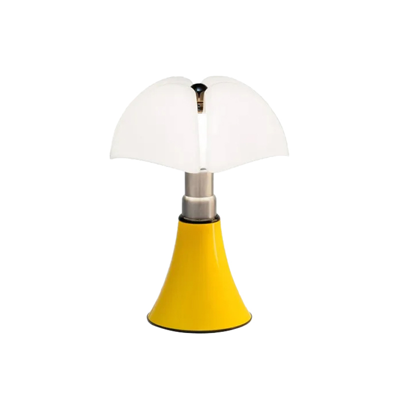 An inimitable lamp with a strong character, Pipistrello designed by Gae Aulenti in 1965 for the Olivetti showroom in Paris, is currently published by the Martinelli Luce lighting house.  Pipistrello Pop Med features the same variations as the original lamp: large, medium and mini, with the latter version also available cordless. Now available in a new yellow colour, signed and numbered. The new yellow colour of Pipistrello Pop Med evokes light, optimism and energy. According to Emiliana Martinelli, "Colour is one of the hallmarks of Pop art, whose protagonist is the everyday object that becomes art, and the iconic Pipistrello is tinted a bright, full, graphic yellow that recalls this artistic movement". The cone of Pipistrello Pop Med is highlighted by a central ring, the base and the diffuser attachment knob, painted gloss black to give the luminaire its graphic appearance. The dimmable LED light source is integrated and the electronic ballast is plug-in. The original Pipistrello Pop Med has become iconic for its ability to combine originality and innovation. The choice of a bright yellow perpetuates this spirit by going beyond aesthetics to become a symbol of vitality, energy and creative drive.
