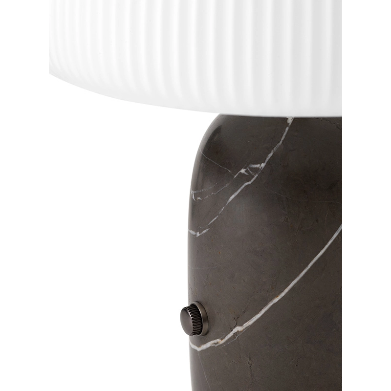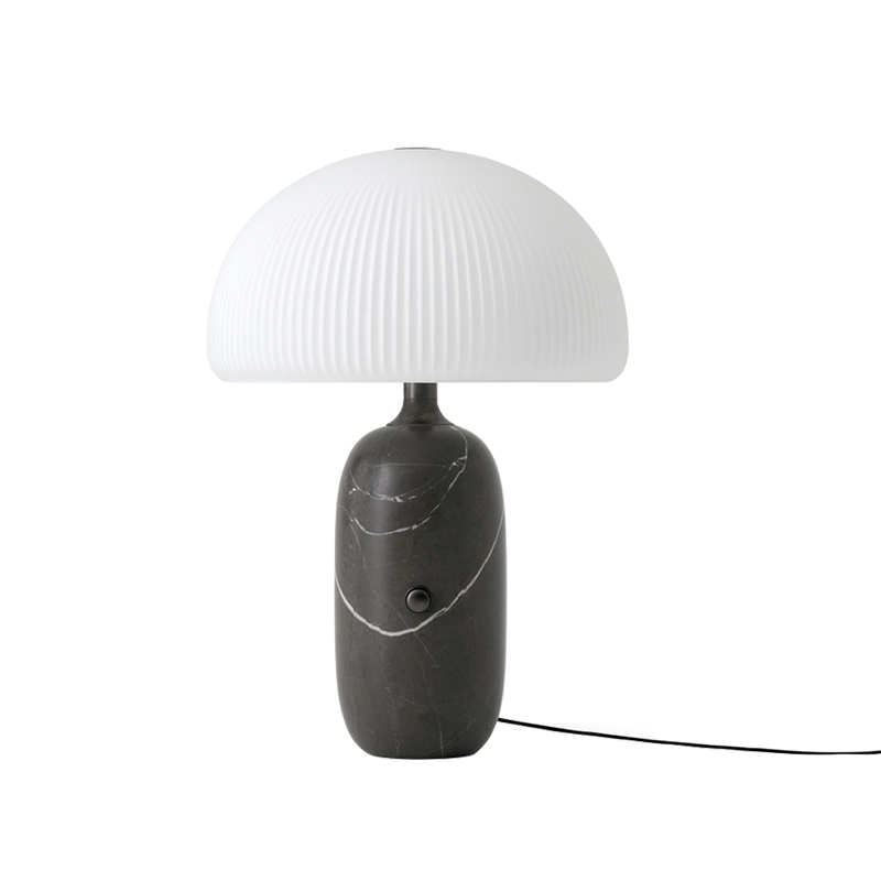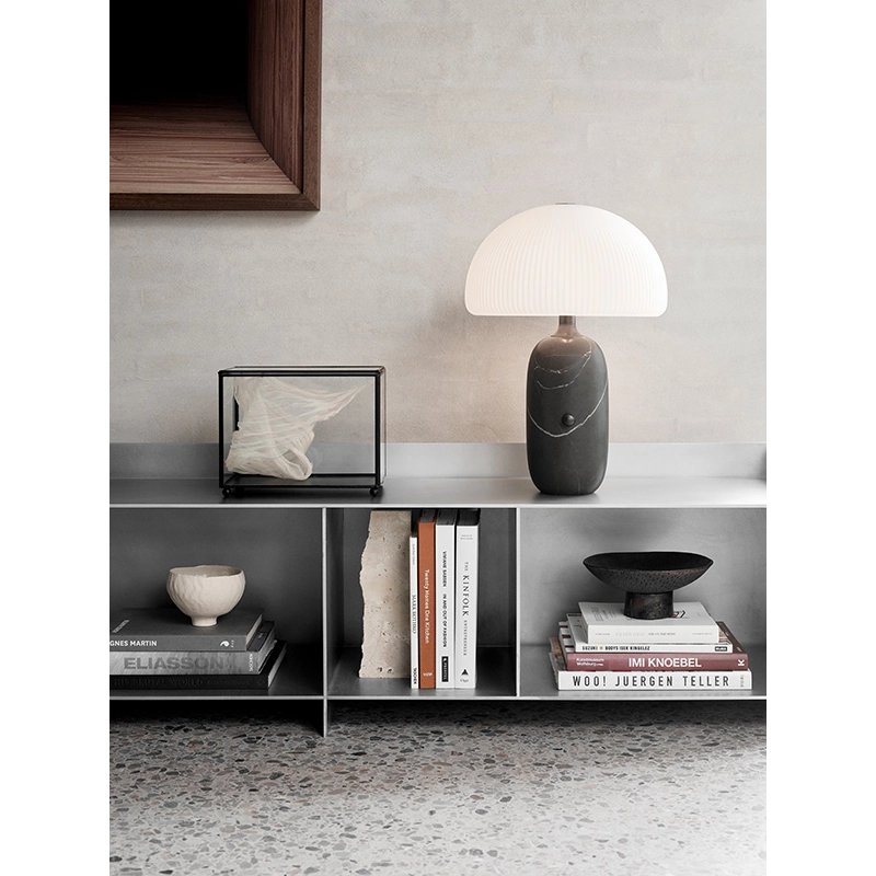 The Sculpture table lamp from Vipp provides ideal decorative lighting for the living room or bedroom. Its three-layer opaline glass shade provides warm LED lighting. The round grey or white marble base of the Sculpture Vipp table lamp features a dimmer switch and fabric-covered power cord.