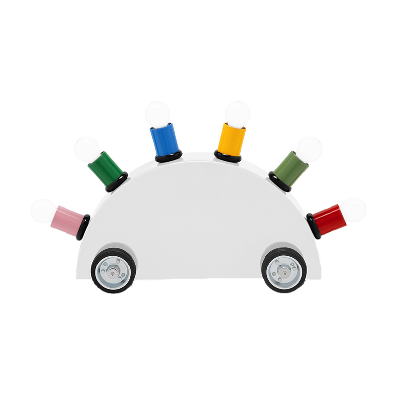 A hybrid object between lighting and play, theSuper lamp by designer Martine Bedin can be dragged like a dog on a lead, perfectly embodying the playful spirit of Memphis. The Super lamp consists of a lacquered fibreglass semi-circle resting on four rubber wheels. Six coloured cylinders contain the bulb sockets. The bulbs themselves are part of the image of the lamp. A perfect blend of play, colour and function, the Super Memphis lamp is a design staple. This product comes with a certificate of authenticity.