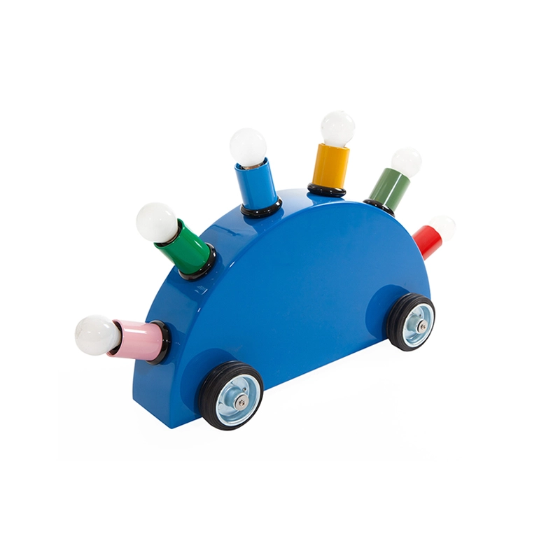 A hybrid object between lighting and play, theSuper lamp by designer Martine Bedin can be dragged like a dog on a lead, perfectly embodying the playful spirit of Memphis. The Super lamp consists of a lacquered fibreglass semi-circle resting on four rubber wheels. Six coloured cylinders contain the bulb sockets. The bulbs themselves are part of the image of the lamp. A perfect blend of play, colour and function, the Super Memphis lamp is a design staple. This product comes with a certificate of authenticity.