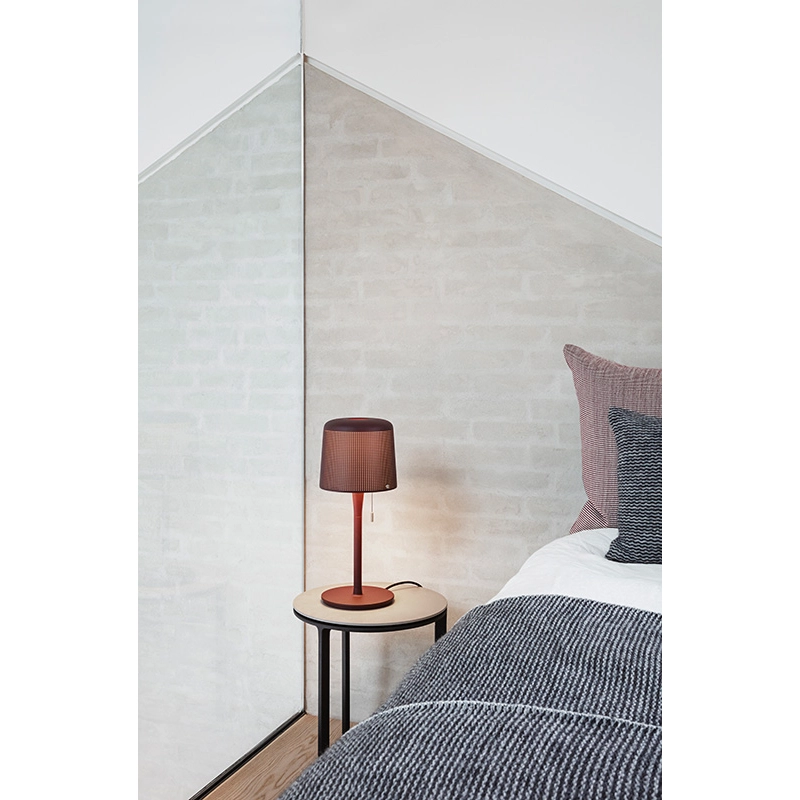The Vipp 530 table lamp is ideal for the living room or bedroom. Vipp 530 features a pull switch and a solid base for stability. An internal reflector directs the light downwards and the perforated shade diffuses the light gently, making it an ideal bedside lamp, or an accent light on a piece of furniture.
