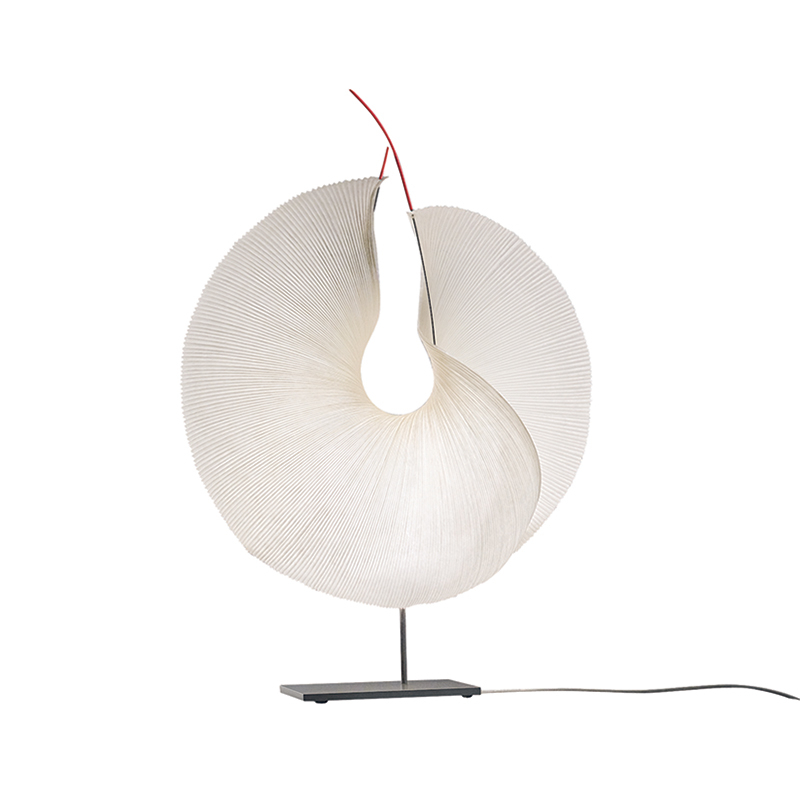 The Yoruba Rose Lamp by designer Dagmar Mombach and Ingo Maurer is an elegant, sculptural piece that automatically catches the eye. The paper bow is stretched almost circularly over thin metal cables and unfurls upwards. The Yoruba Rose lamp features a harmonious silhouette and a soft, pleasant light source. The harmonious expression of the model and its extremely pleasant light make it the ideal light source for rooms in which you want to relax.