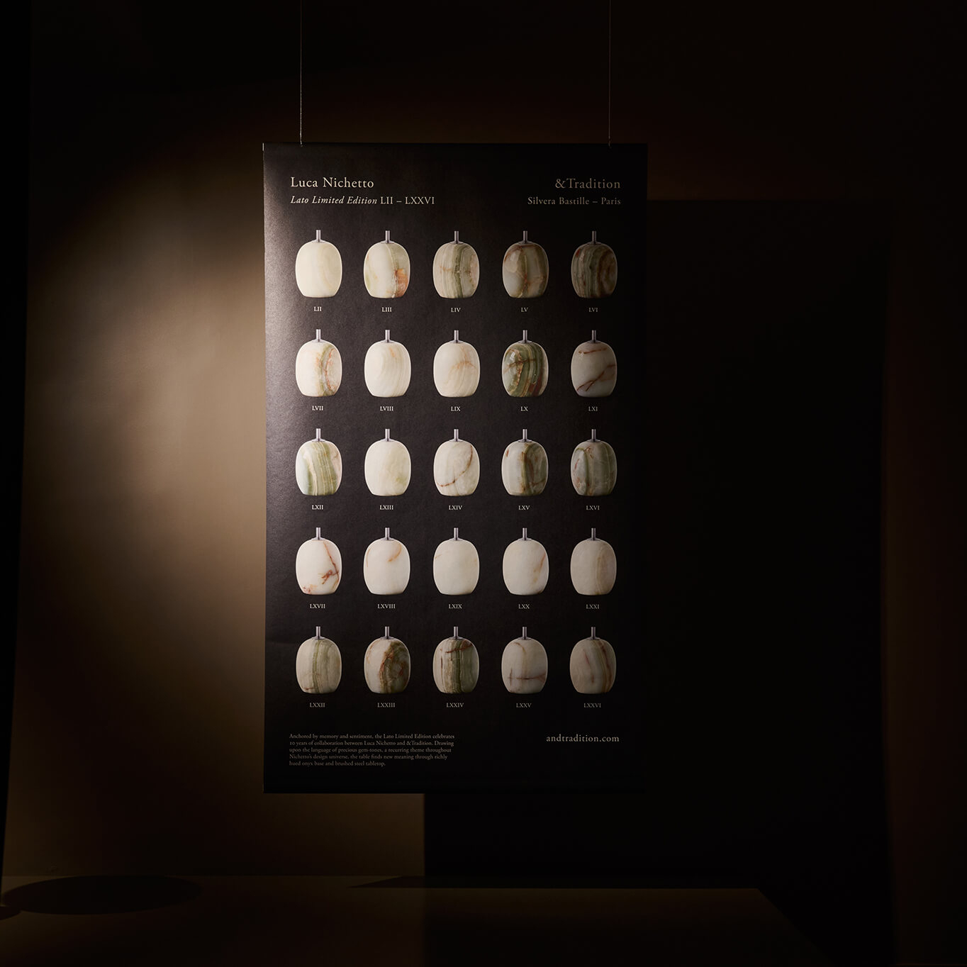 To celebrate 10 years of collaboration with designer Luca Nichetto, &Tradition is launching a limited edition of the Lato table, a model that combines craftsmanship and emotion. This limited edition reinterprets the original design with striking new materials. Produced in only 100 copies, it retains its sculptural beauty while introducing a new material expression. A milky onyx base is inspired by the language of precious stones, a recurring theme in Nichetto's creative universe, and the natural variations in the stone ensure that each table is unique. Brushed steel adds a modern, industrial touch.