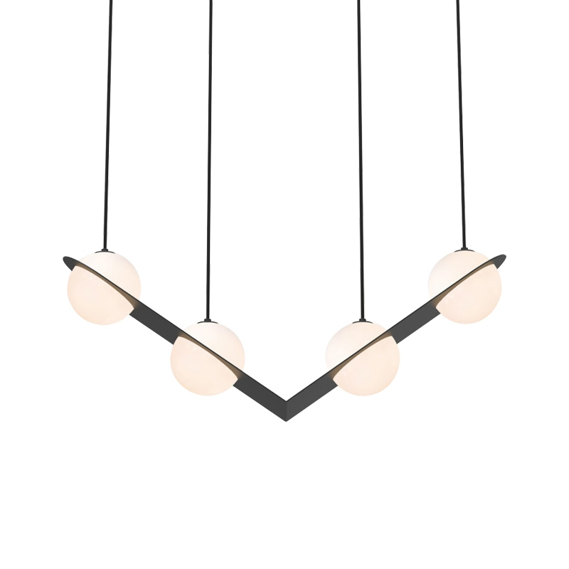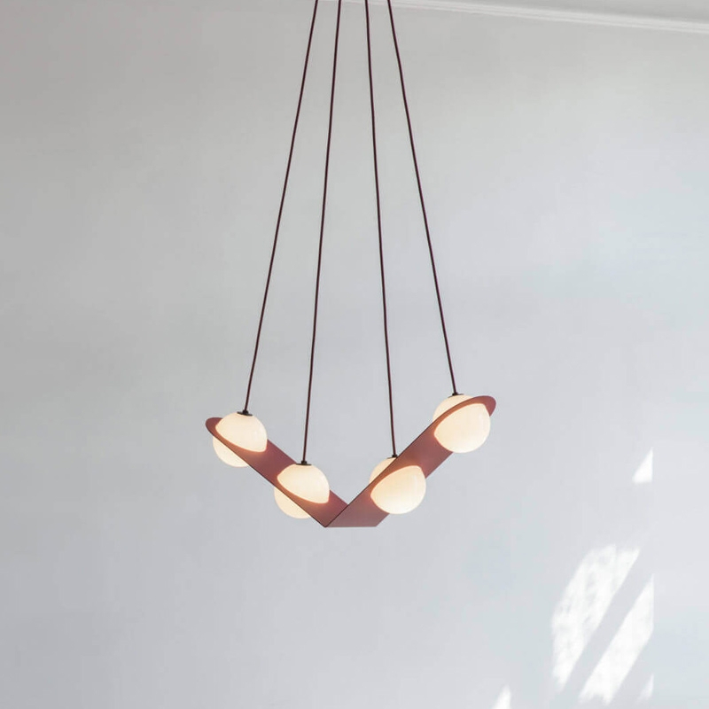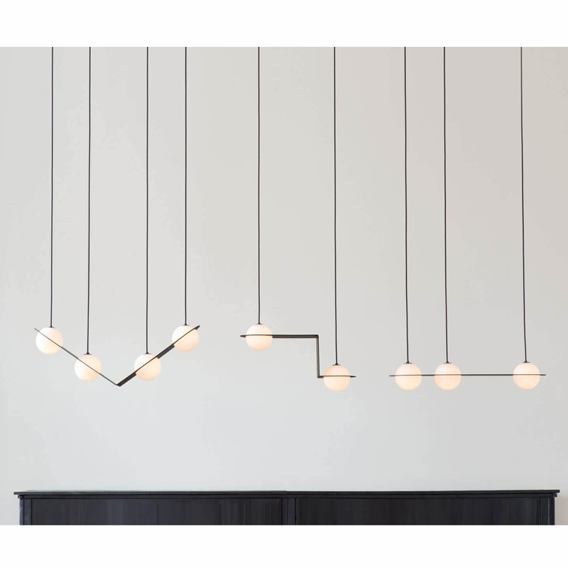 Lambert & Fils, the opal glass globe is returned to the essence of its geometric form. In this collection of graphic lighting fixtures, an assortment of fine structures are fitted around the globes, shaping each piece and moving between line, surface and volume. The lamps in the
