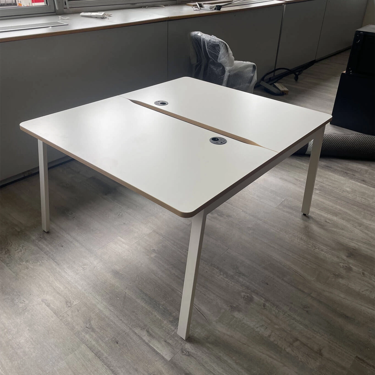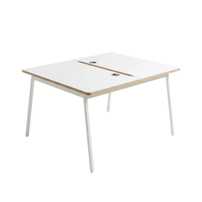 Standard white melamine-faced tops with a white metal finish, rounded outer corners, Napoli oak edges, a central cutout for a partition screen, and tops that meet at the ends beneath the screen