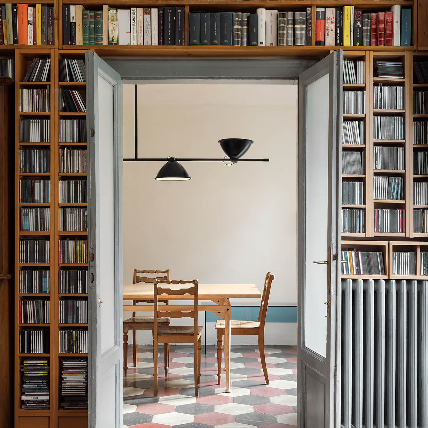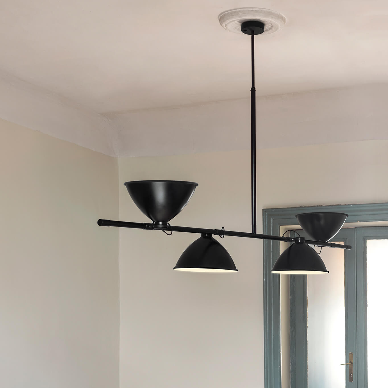 The LBB01 Nemo suspension lamp was designed in 1950 by Lina Bo Bardi for the Casa de Vidro, an emblematic project of Brazilian modernist architecture. This designer suspension lamp stands out for its essential, geometric design in which lines and volumes touch and intersect, in total continuity with the style of the São Paulo house. Produced by Nemo, LBB01 has a telescopic stem and 340° adjustable diffusers for direct and indirect lighting. The exterior of the diffusers is in black-painted aluminium, while the interior is finished in matt white to reflect the light more effectively.