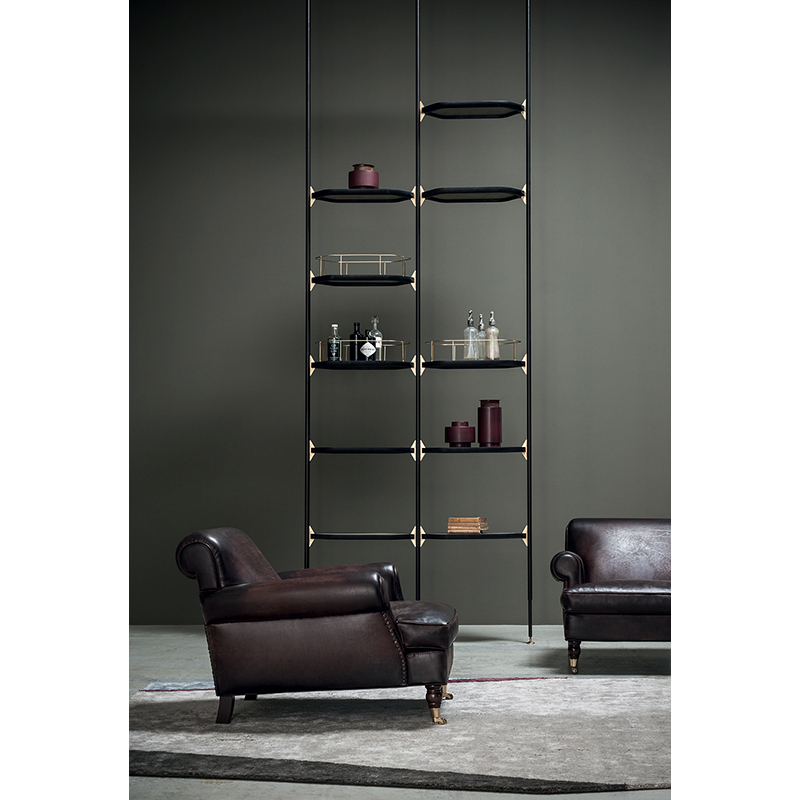 Libelle is a modular bookcase fixed to the ceiling or wall by satin-finish brass pins. The structure of the