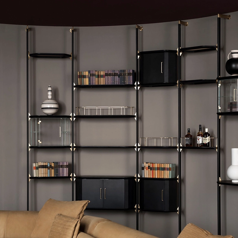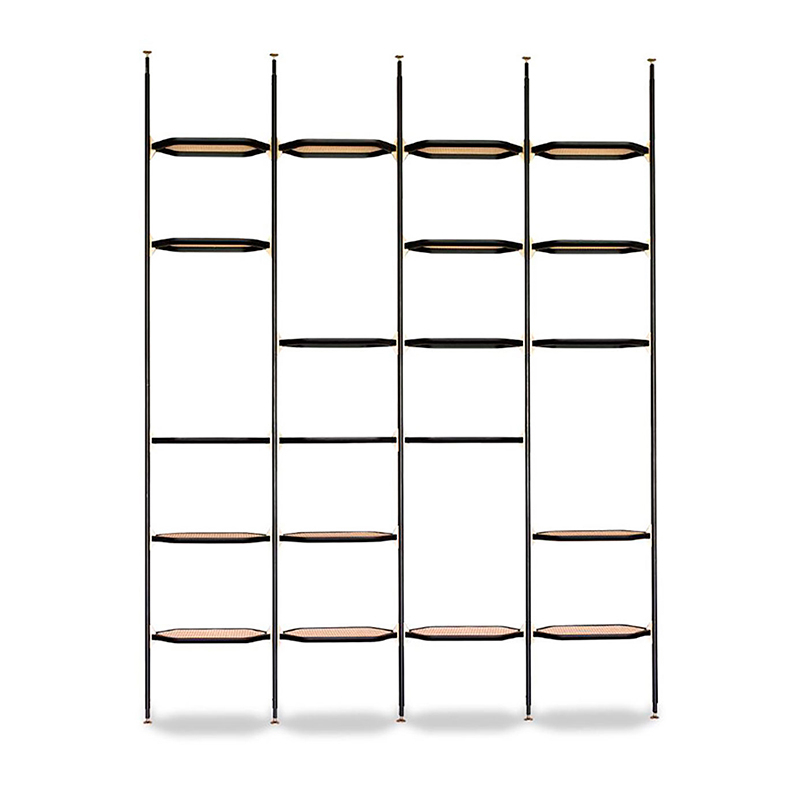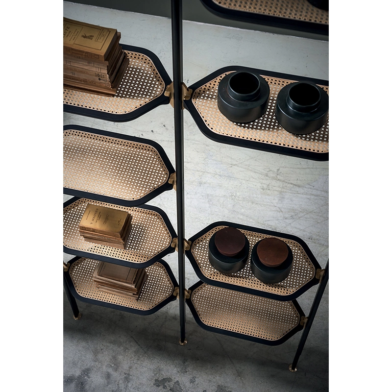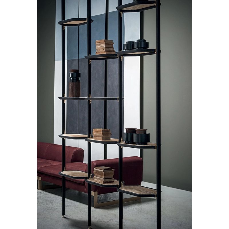 Designed by Pietro Russo for Baxter Made in Italy, Libelle is a modular bookcase fixed to the ceiling or wall by satin-finish brass pins. The structure of the Libelle bookcase is in matt black varnished tubular aluminium. The shelves in the Libelle bookcase are in black-stained maple with rattan or leather-covered interior, honey maple with black cane or leather-covered interior. With its clean lines, mix of materials and infinite possibilities, the Libelle bookcase from Baxter Made in Italy, blends perfectly with all types of interiors. Contact us for more information.