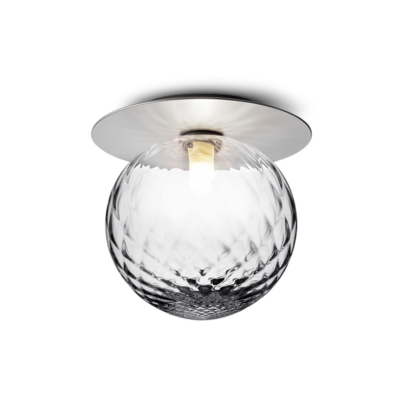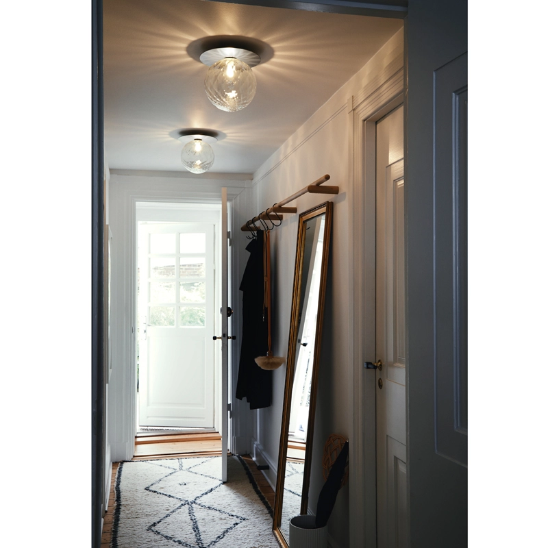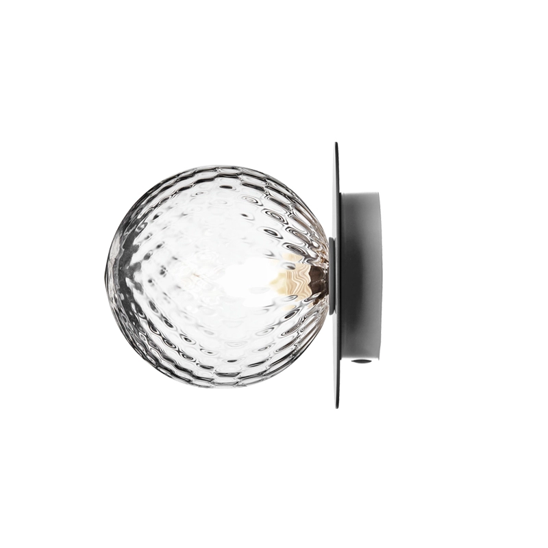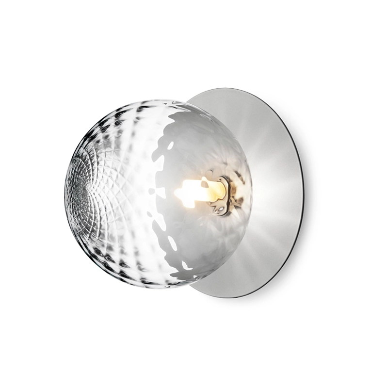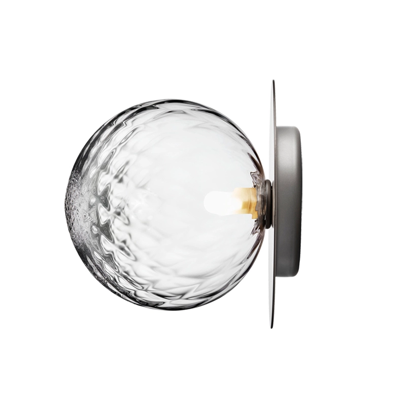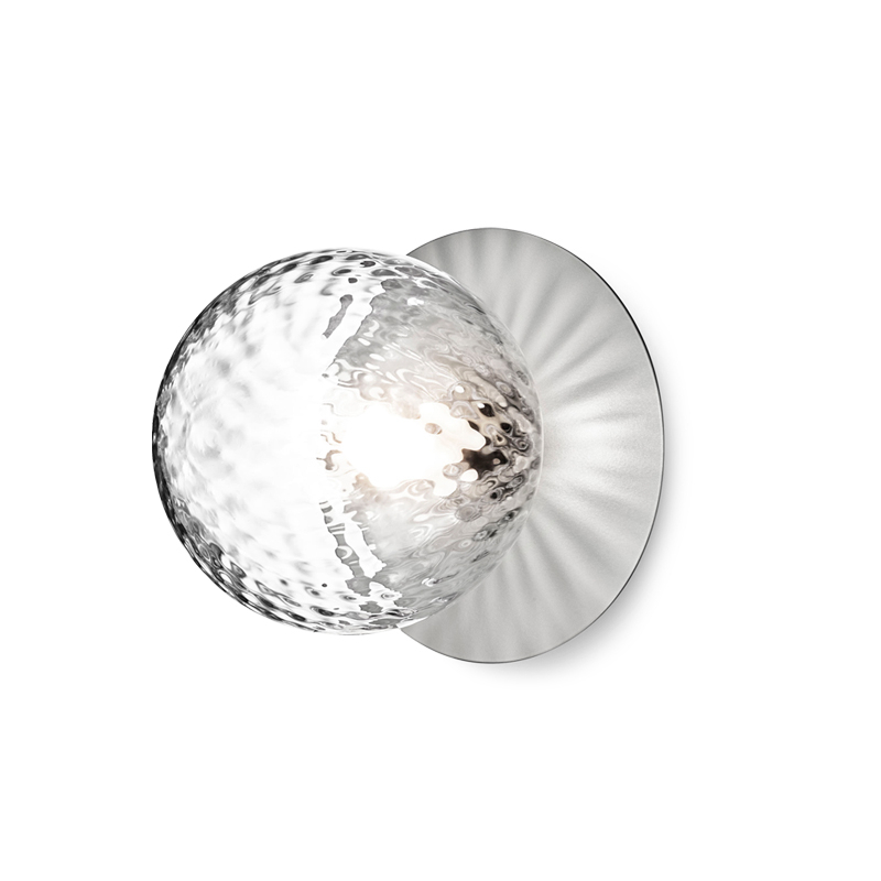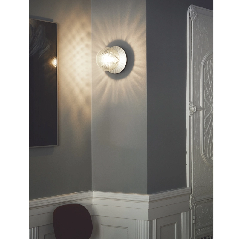 Liila is a collection of sleek lamps that can be installed on a wall or ceiling. Simple and elegant, the Liila lamp consists of a round sheet of metal combined with a sphere of blown glass finished in opaline white or transparent with an embossed pattern. The transparent glass version with relief pattern creates sparkling light effects, while the opal model emits a soft light. Available in two sizes, the Liila lamp, edited by Nuura, fits into any room in the house.