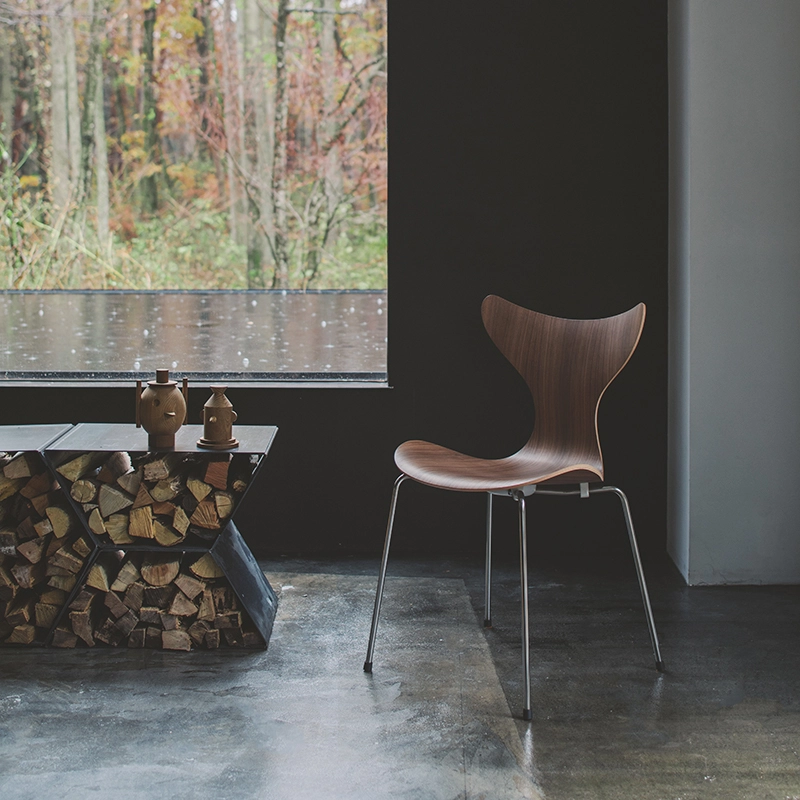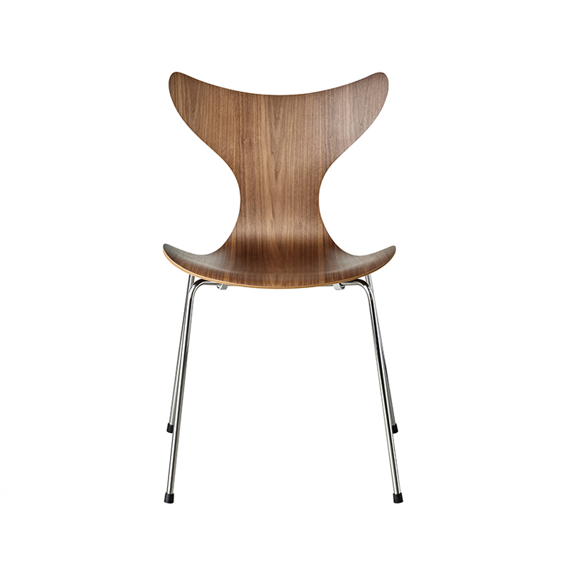Lily chair, with its chromed steel base, is dressed in walnut. This is the first time