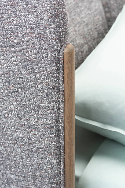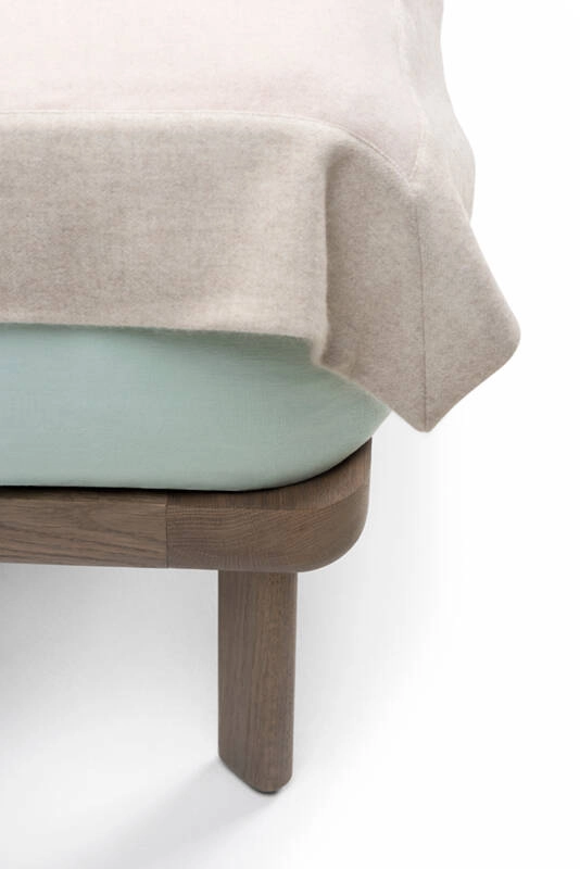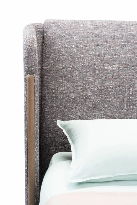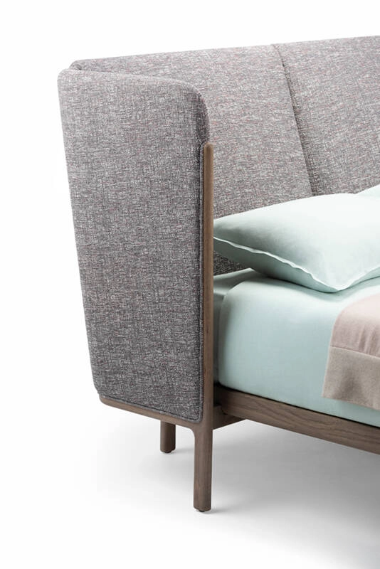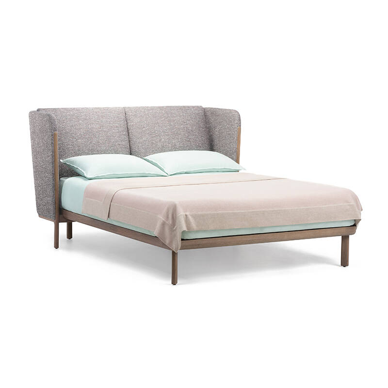 Dubois is a bed system made from premium solid hardwood and luxurious fabrics. The wrap-around headboard offers a sense of intimacy, while the exposed wooden structure and generous expanse of upholstery celebrate the quality of materials and craftsmanship. Suitable for residential or contract environments, the bed is available with a low or high headboard, with or without integrated bedside tables.